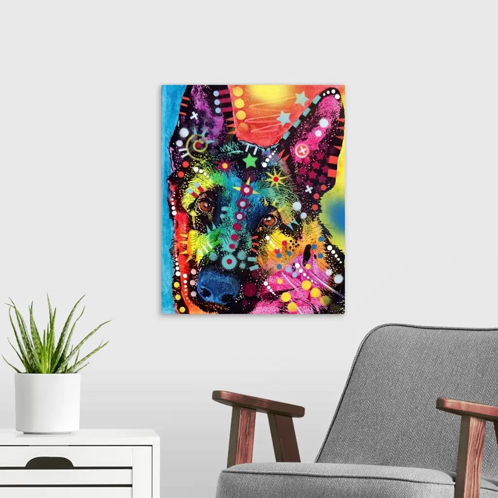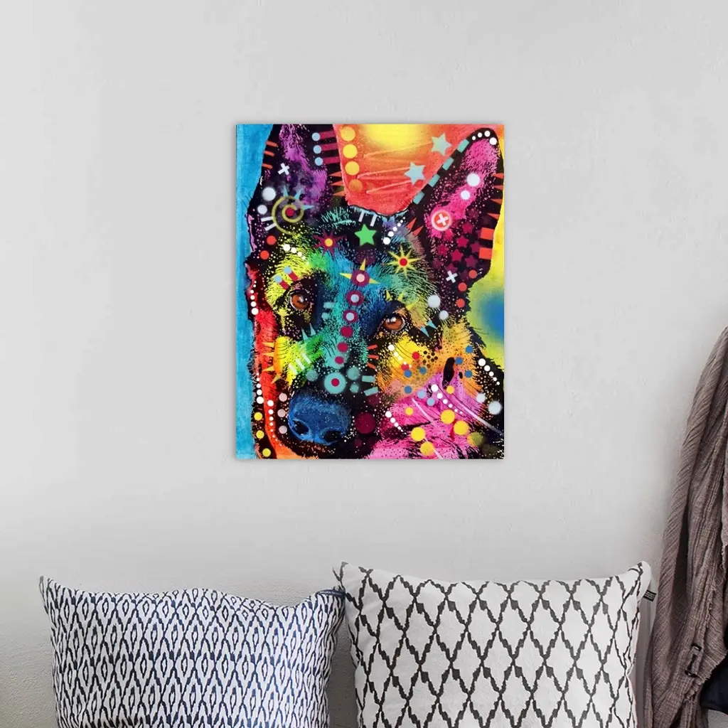 Contemporary stencil painting of a german shepherd filled with various colors and patterns.