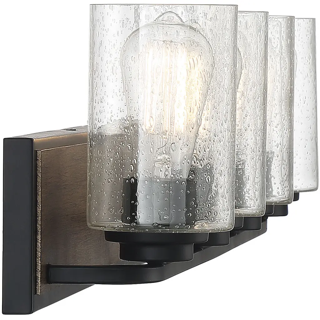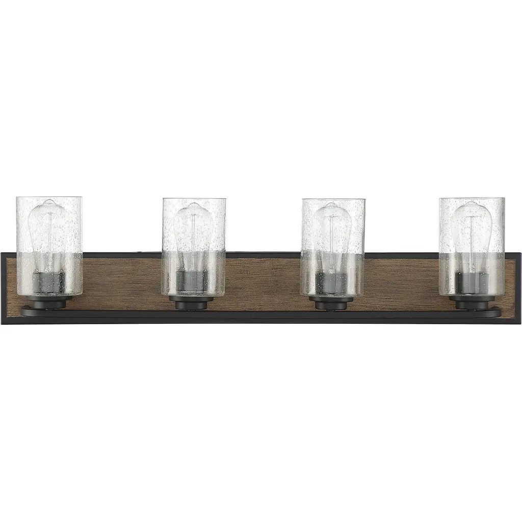 Rustic style gets a touch of contemporary allure in this Sheppard 4-light bathroom vanity light. It features a dark finish paired with a panel finished in Lodge on the backplate for textural appeal. Clear seeded glass shades add in even more texture. 8.5" height and 32.75" width. Extends 6" from the wall. Uses 4 standard size bulbs of up to 60 watts per bulb. Damp area rated.