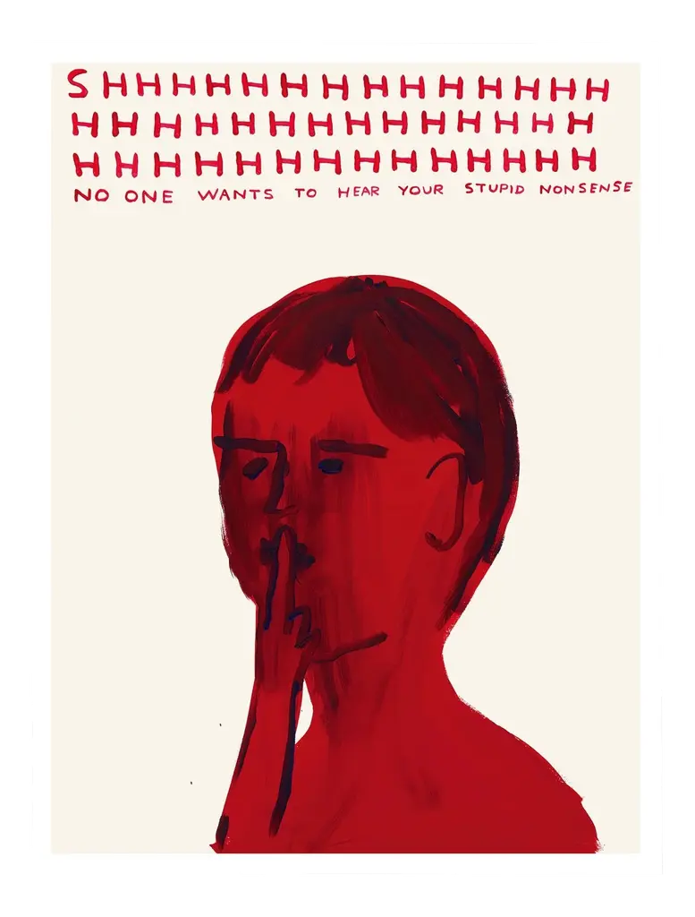 David Shrigley, Shhh, 2023 Printed on 200g Munken Lynx paper by Narayana Press in Denmark 50 x 70 cm (23.62 x 31.50 in) Open Edition Accompanied by a Certificate of Authenticity A red figure holds a finger to their lips. Above, red text reads 'Shhhhhhhhh no one wants to hear your stupid nonsense' David Shrigley, born in Macclesfield in 1968, is a British artist based in Brighton. Having graduated from the Glasgow School of Art in 1991, Shrigley has since gained international recognition for his distinctive drawings, sculptures, and text-based works. Known for his dark humour and deliberately crude style, Shrigley explores the absurdities of everyday life with wit and sharp social commentary. A 2013 Turner Prize nominee, his work has been exhibited globally.