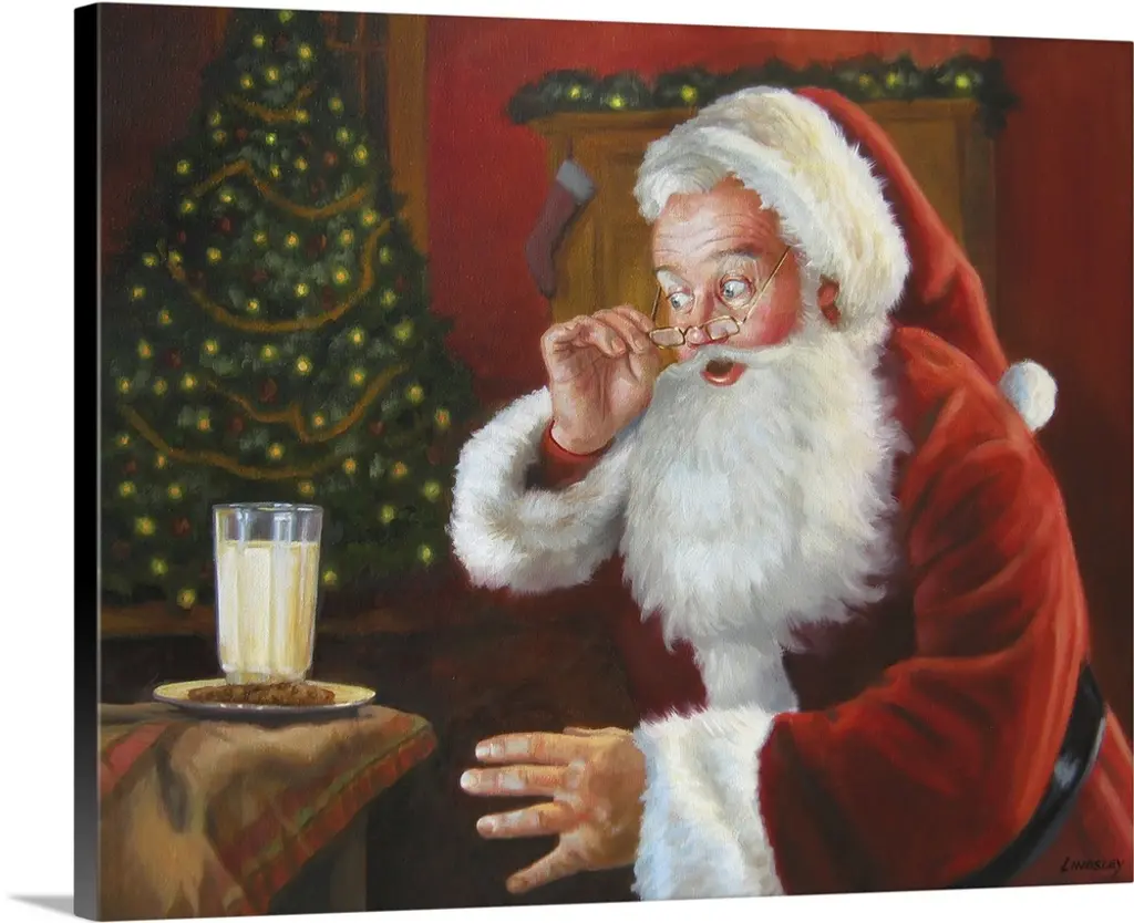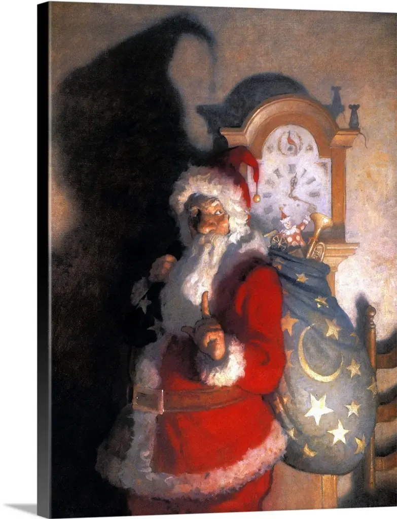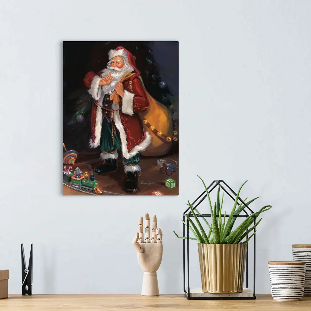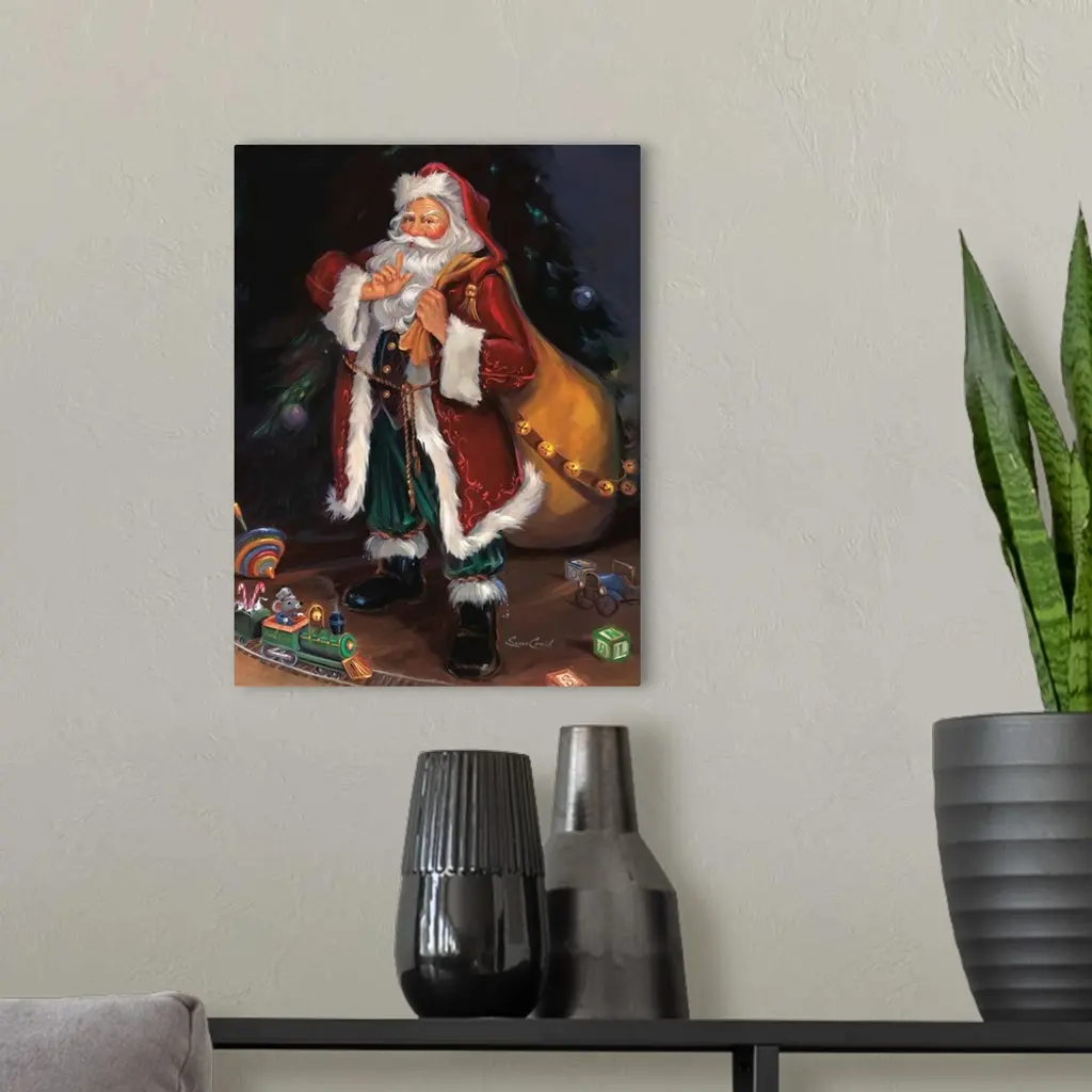 Fine art painting of Santa Claus wearing a red coat with toys at his feet.