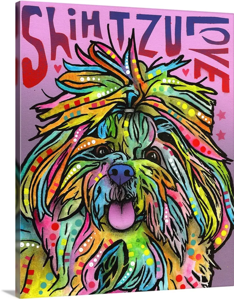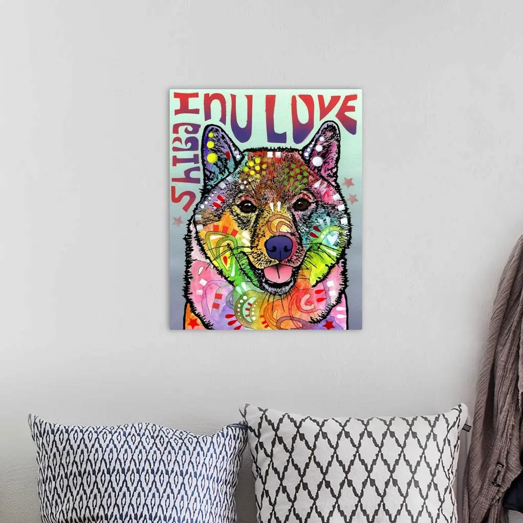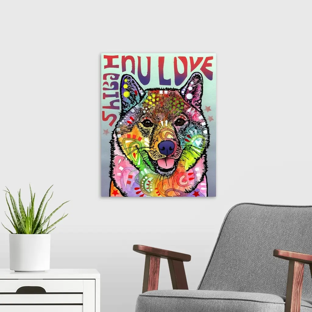 "Shiba Inu Luv" written around a colorful painting of a Shiba Inu with abstract markings.