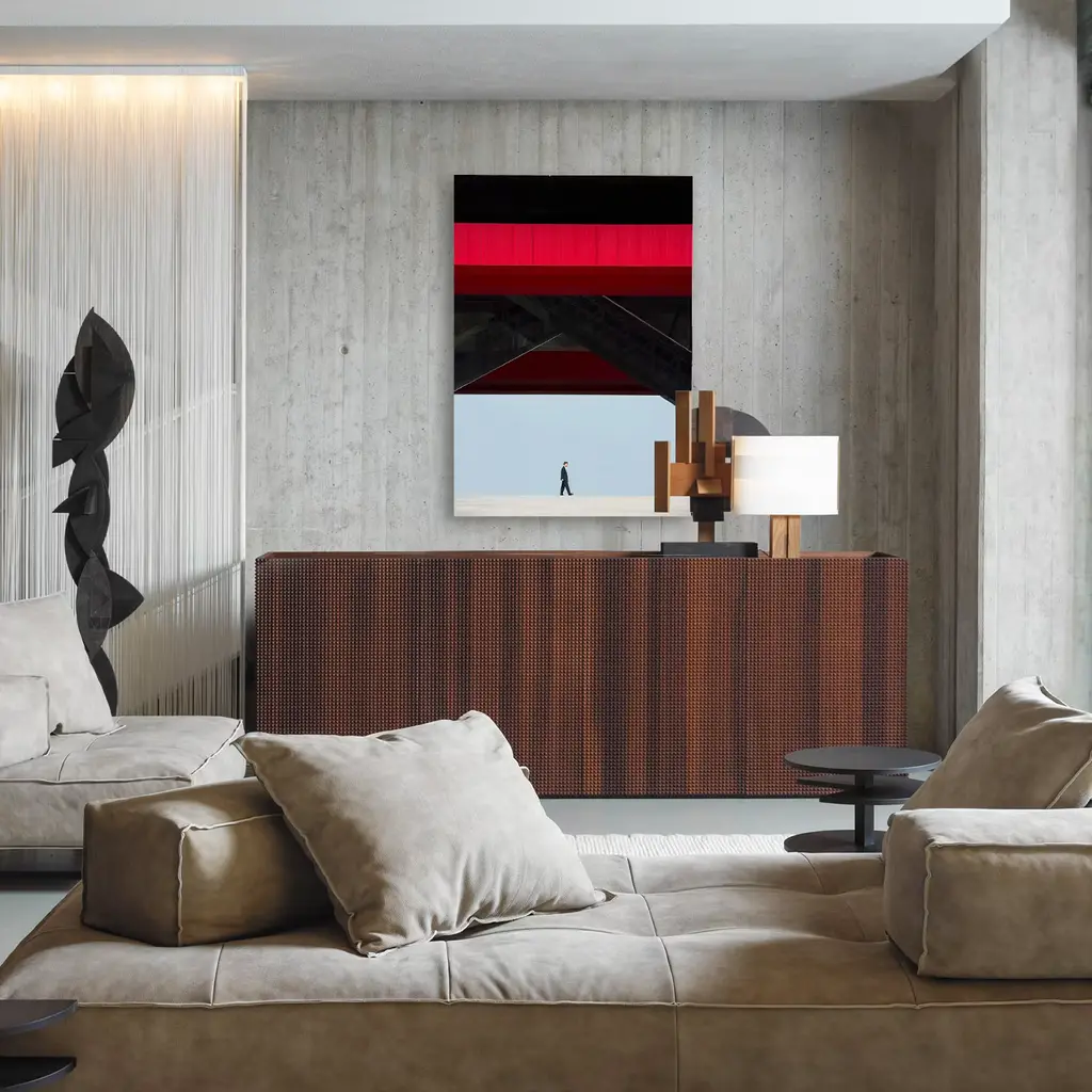 Shibo depicts the human subject in relation to the modernity it has helped to create. The sense of loneliness that emerges is enhanced through the construction of the work: the upper part represents the architectural forms of the modern world in which we live in, while in the lower part there is a lonely man immersed in a blue sky. The technique used is Chromaluxe. The frame is included. Delivered with a certificate of authenticity. Please, ask the Concierge for customization options.