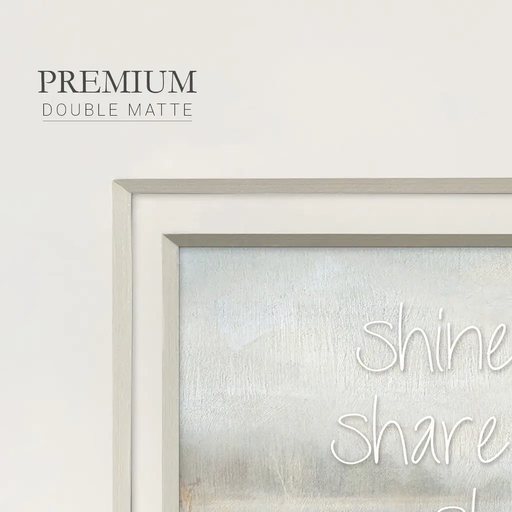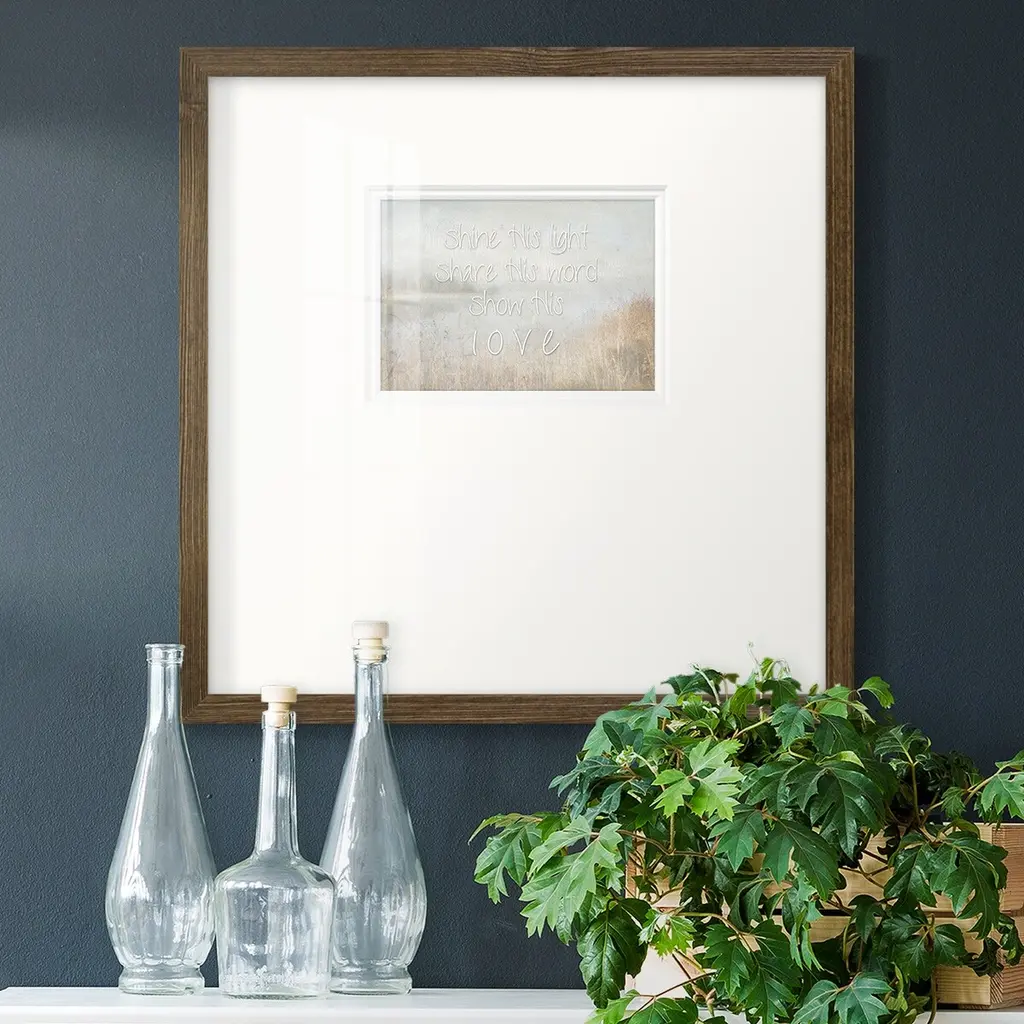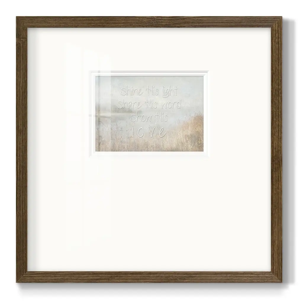 Shine His LightPremium Framed Print A framed cold pressed paper print featuring superior double matting and quality frame. 2 SIZES AVAILABLE 16''X16''' - Overall Size 20''X20''' - Overall Size Each piece is made to order. Each piece comes with hanging hardware. Made in the USA Ready to Hang Giclee Paper Print Plexiglass Beveled Matt Board Double Matte Board