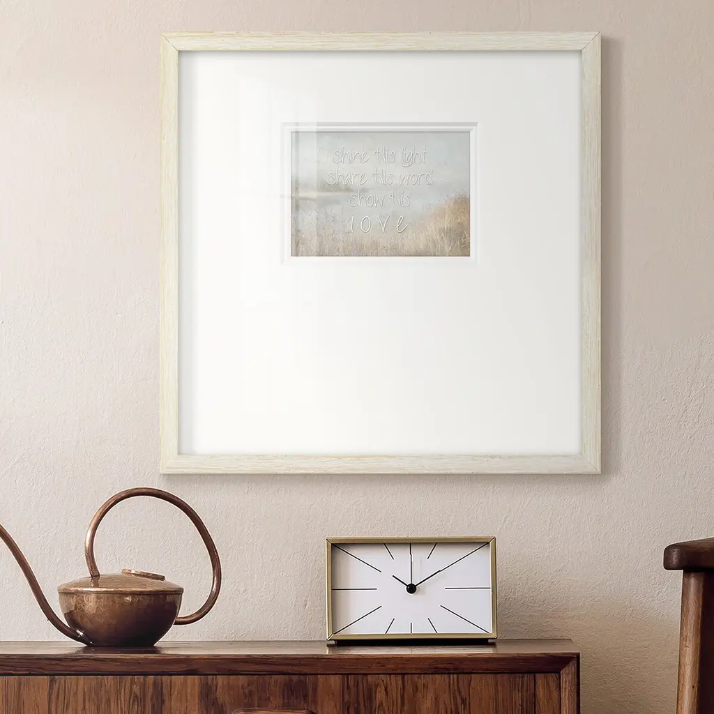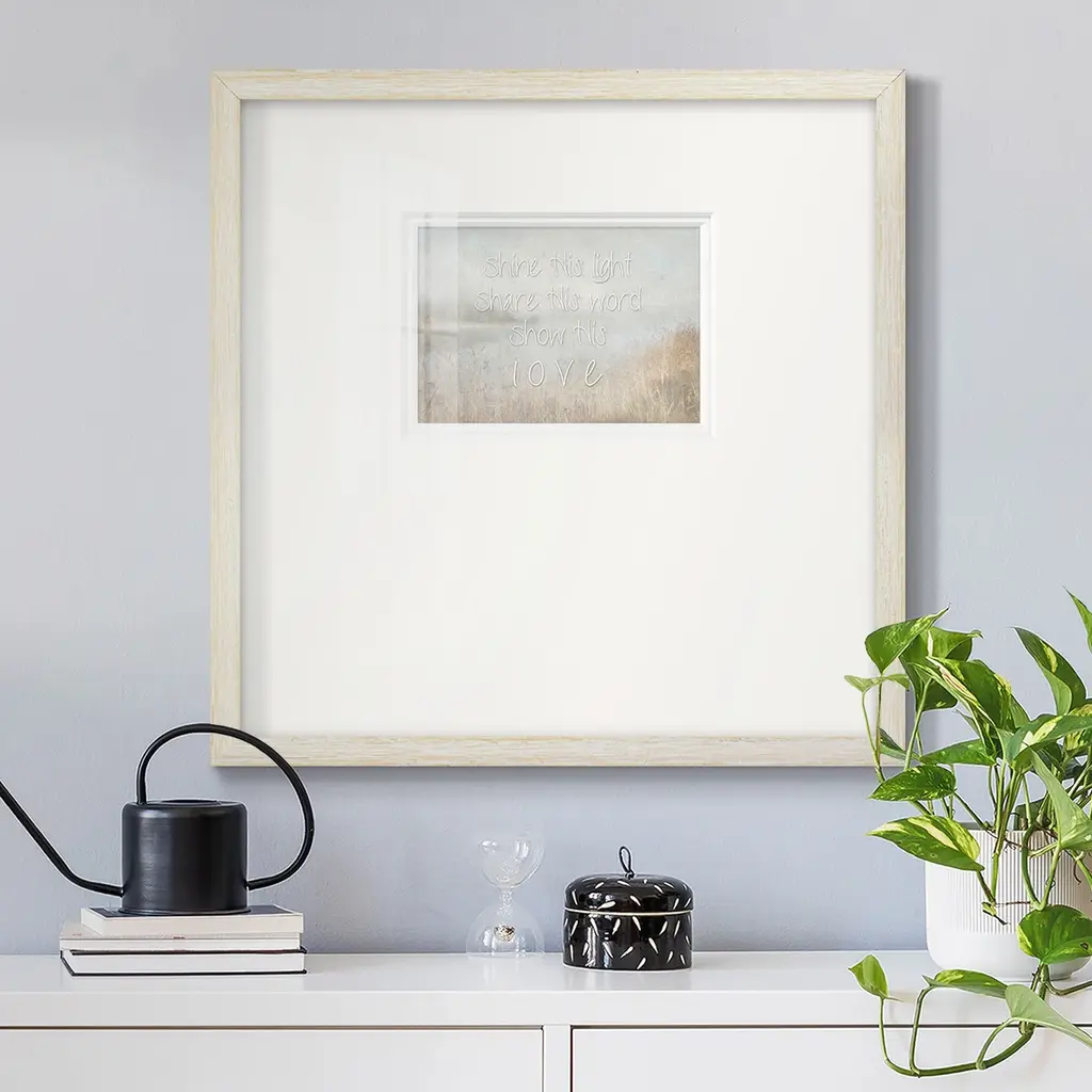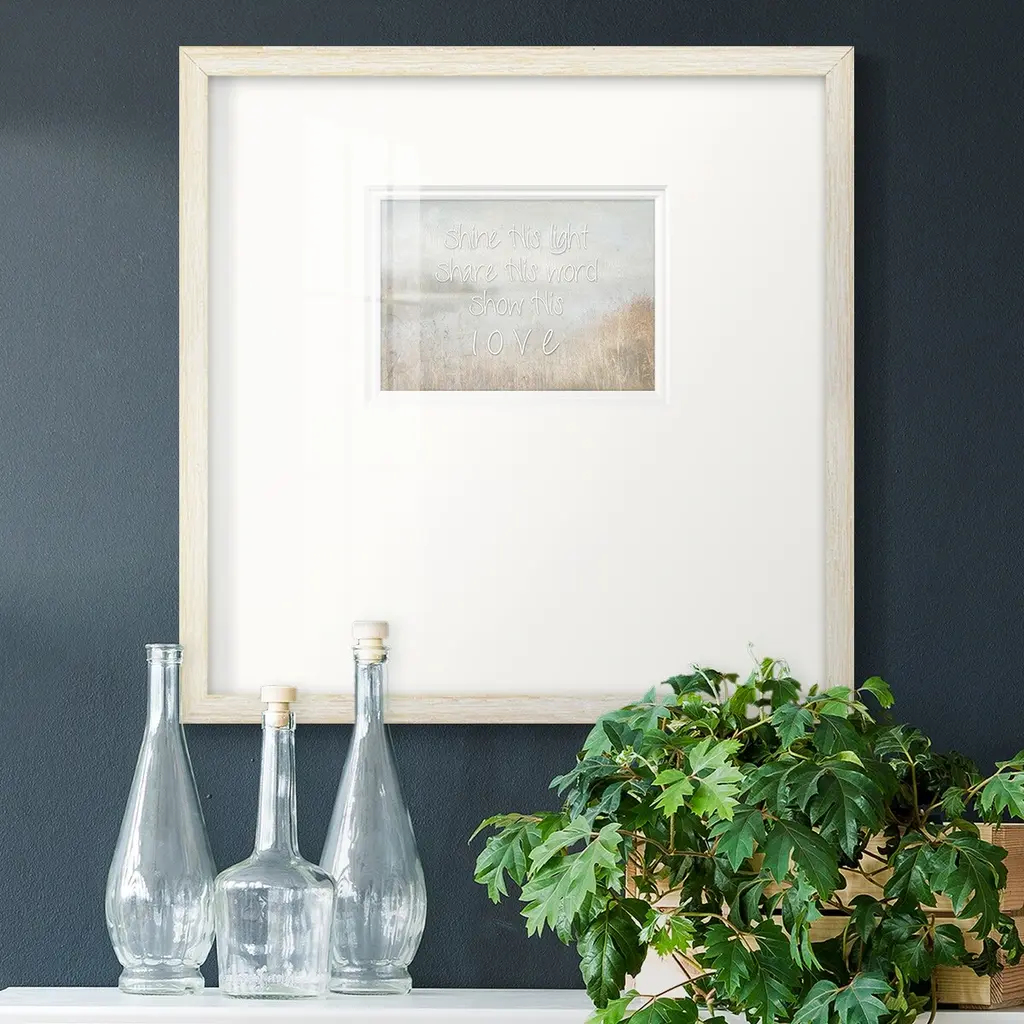 Shine His LightPremium Framed Print A framed cold pressed paper print featuring superior double matting and quality frame. 2 SIZES AVAILABLE 16''X16''' - Overall Size 20''X20''' - Overall Size Each piece is made to order. Each piece comes with hanging hardware. Made in the USA Ready to Hang Giclee Paper Print Plexiglass Beveled Matt Board Double Matte Board