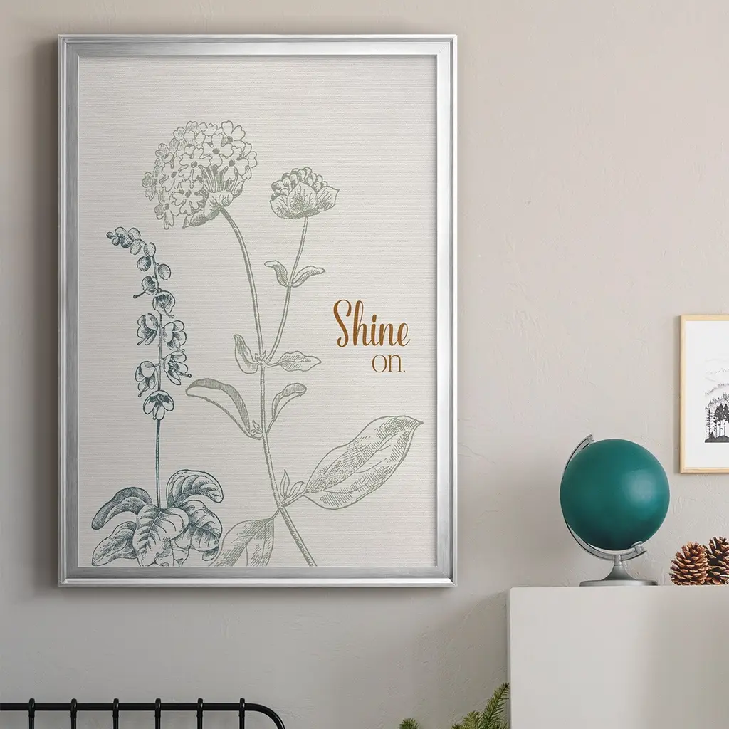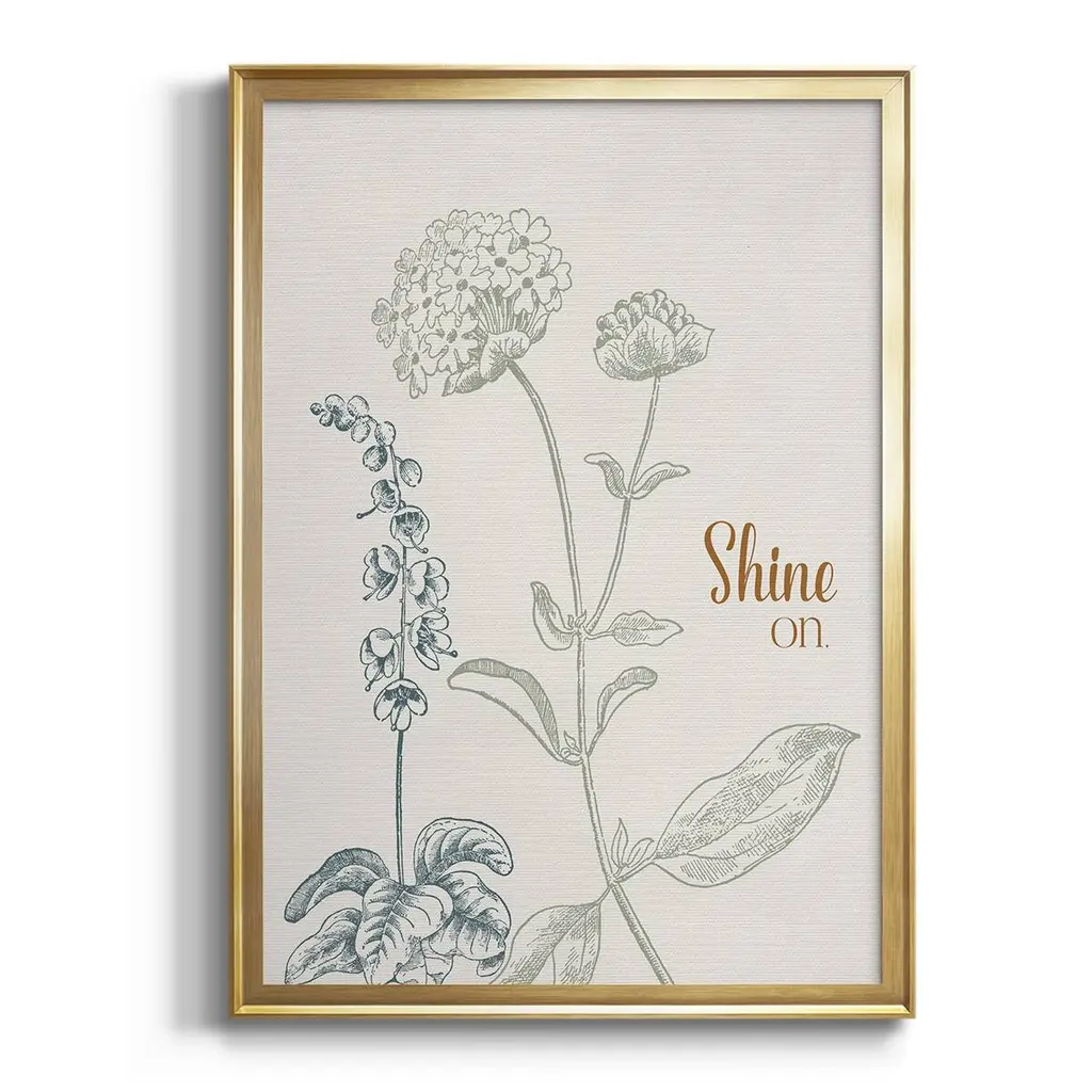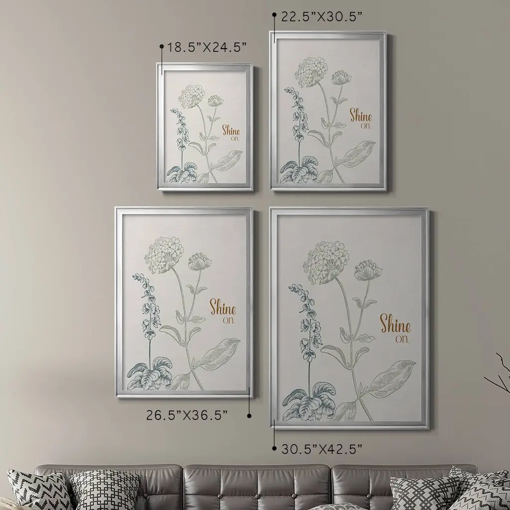 Shine On Premium Framed Print - Ready to Hang A Premium Framed Print created to last. Framed in distressed wood and available in an array of sizes and colors Featuring a beveled a solid wood stretcher bar, each piece comes ready to hand 4 SIZES AVAILABLE 30.5''X42.5'' - Overall Size 26.5'X36.5'' - Overall Size 22.5''x30.5'' - Overall Size 18.5''x24.5'' - Overall Size Each piece is made to order. Each piece comes with hanging hardware. Made in the USA Ready to Hang