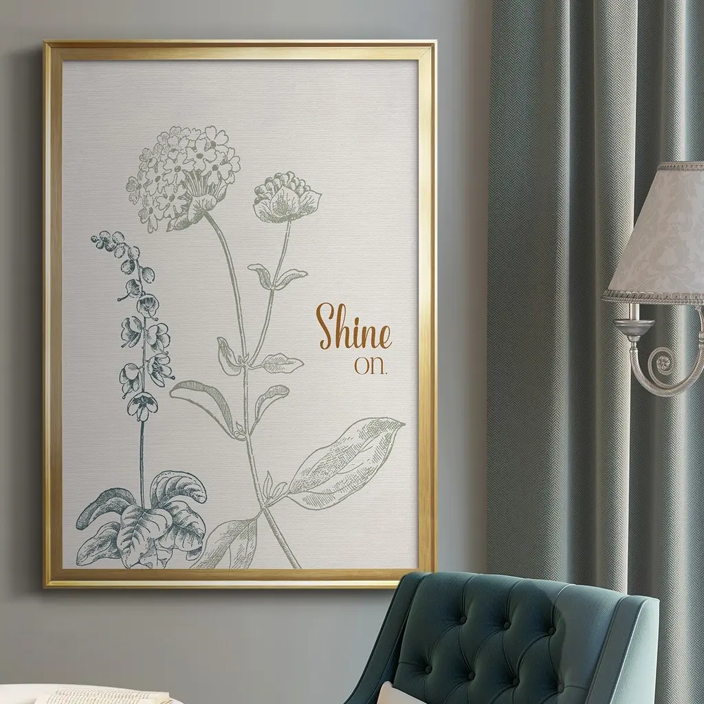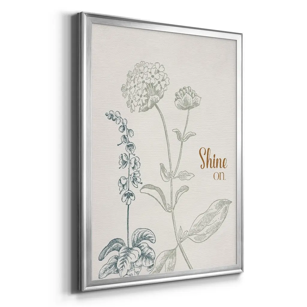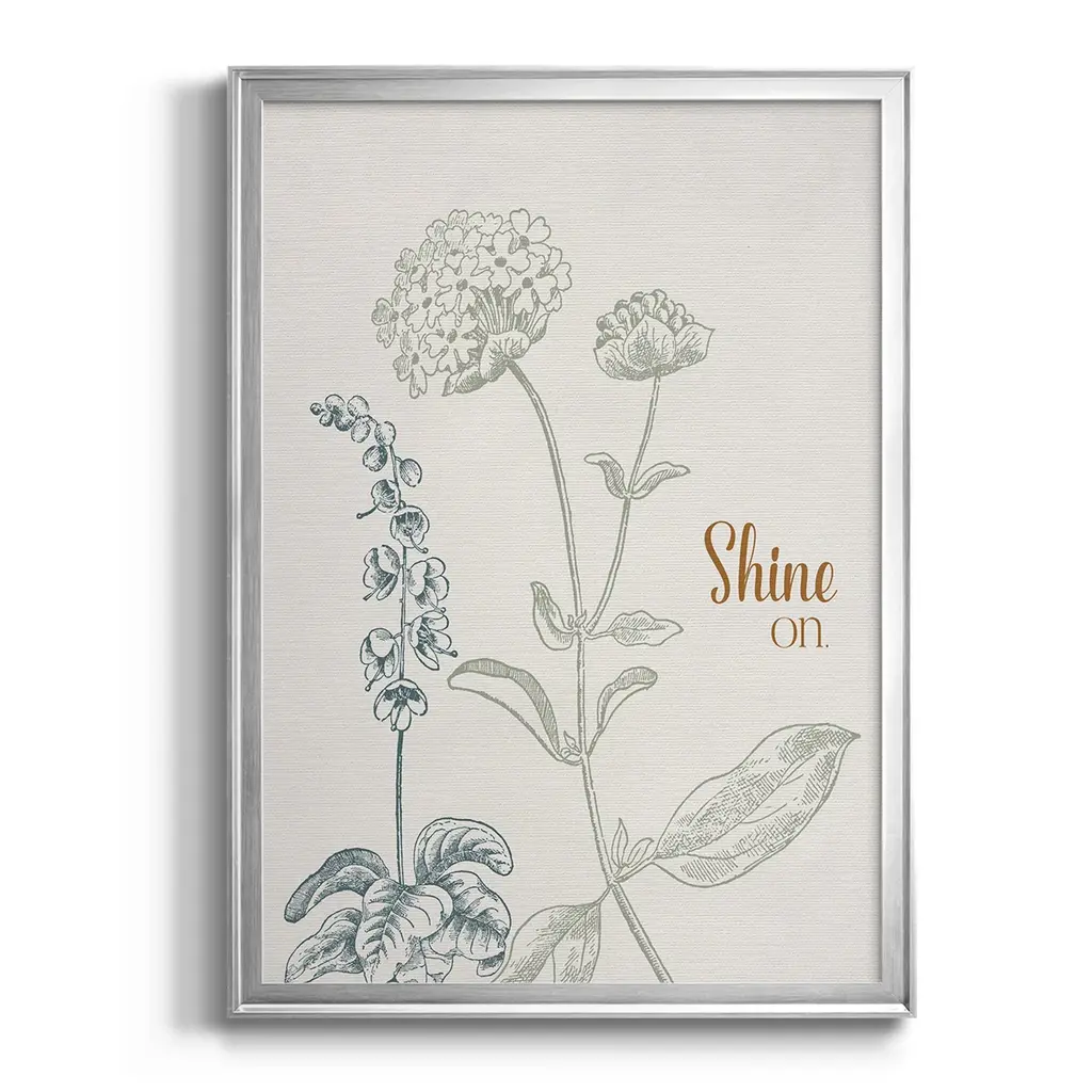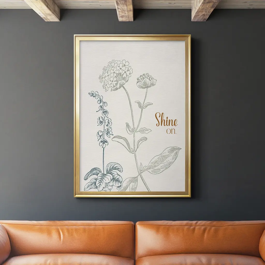 Shine On Premium Framed Print - Ready to Hang A Premium Framed Print created to last. Framed in distressed wood and available in an array of sizes and colors Featuring a beveled a solid wood stretcher bar, each piece comes ready to hand 4 SIZES AVAILABLE 30.5''X42.5'' - Overall Size 26.5'X36.5'' - Overall Size 22.5''x30.5'' - Overall Size 18.5''x24.5'' - Overall Size Each piece is made to order. Each piece comes with hanging hardware. Made in the USA Ready to Hang
