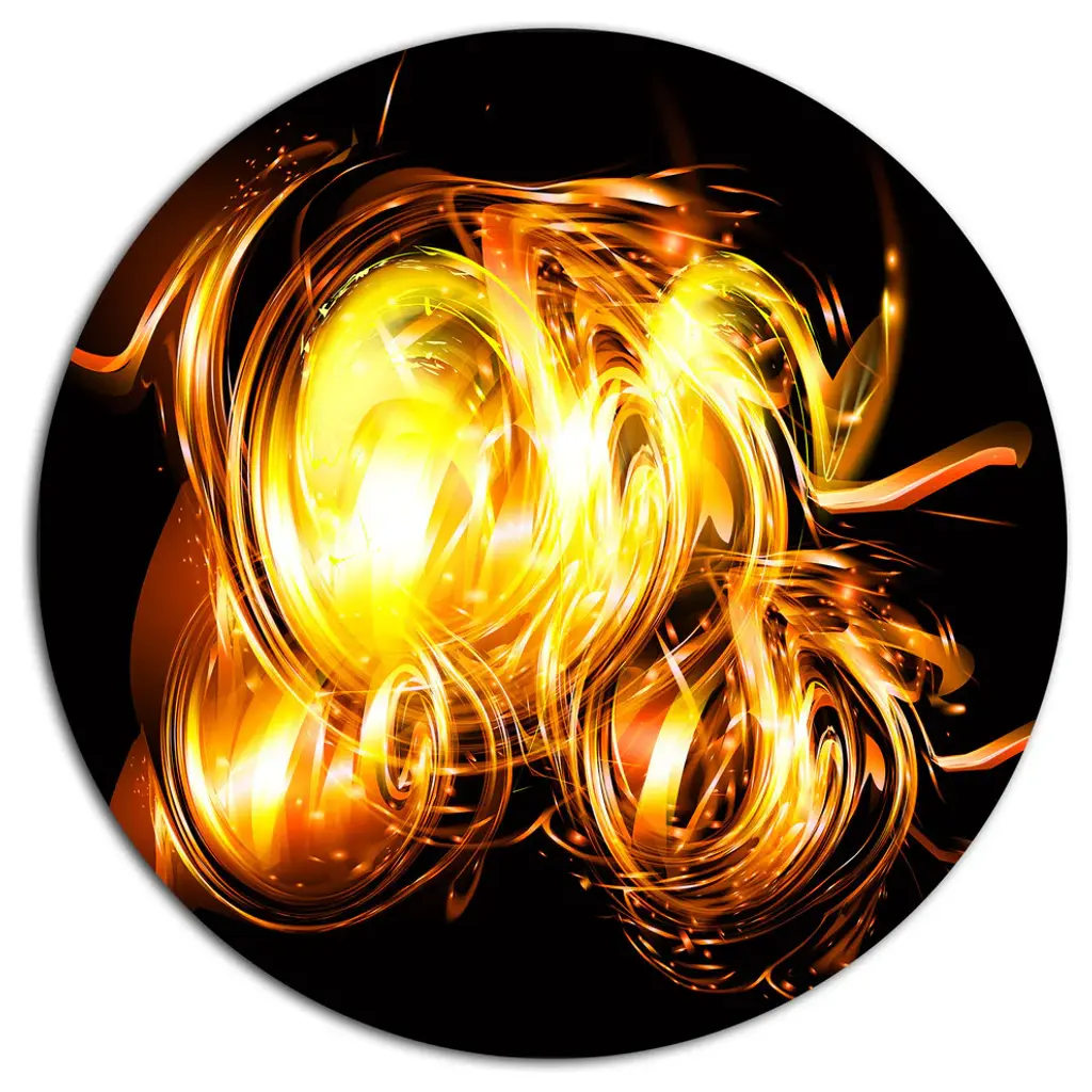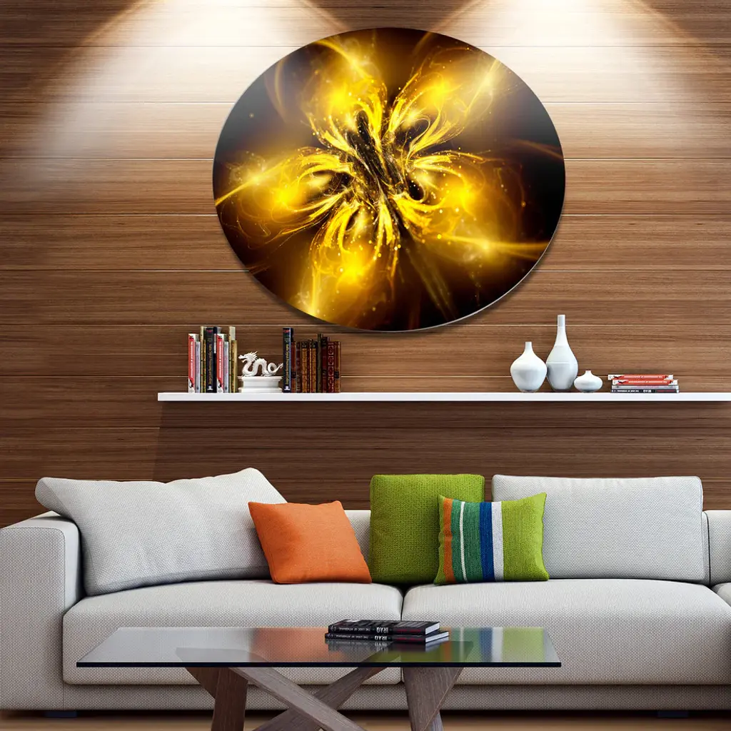 Bring Contemporary Abstraction to your home with this large Circle Metal wall art. This Shiny Gold Fractal Flower on Black Metal Artwork makes it the focal point of any room or office. - White Gloss Coating ensures colors are extra vibrant with light reflection.- Aluminum grade Sheet Metal with 1 inch mounting frame on the back giving the illusion that the artwork is floating on the wall..- Mounting Brackets are included along with instructions.- High Quality Digital images are created directly into a glossy aluminum panel producing a stunning and captivating print into the glossy finish of the metal.- Water, Fire and Scratch resistant HD Aluminum panels.- Looks better than any photo paper and guaranteed to last at least 20 years- Easy to clean with a microfiber cloth. Colors are far superior to regular Canvas Art. - Easy to Hang