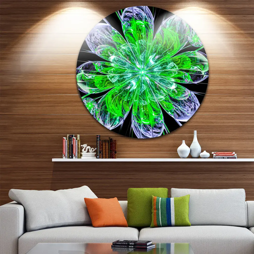 Bring Contemporary Abstraction to your home with this large Circle Metal wall art. This Shiny Green Purple Fractal Flower on Black Metal Artwork makes it the focal point of any room or office. - White Gloss Coating ensures colors are extra vibrant with light reflection.- Aluminum grade Sheet Metal with 1 inch mounting frame on the back giving the illusion that the artwork is floating on the wall..- Mounting Brackets are included along with instructions.- High Quality Digital images are created directly into a glossy aluminum panel producing a stunning and captivating print into the glossy finish of the metal.- Water, Fire and Scratch resistant HD Aluminum panels.- Looks better than any photo paper and guaranteed to last at least 20 years- Easy to clean with a microfiber cloth. Colors are far superior to regular Canvas Art. - Easy to Hang