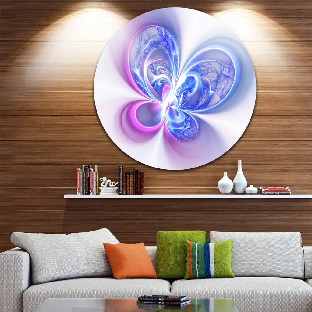 Bring Contemporary Abstraction to your home with this large Circle Metal wall art. This Shiny Purple Blue Digital Fractal Flower Metal Artwork makes it the focal point of any room or office. - White Gloss Coating ensures colors are extra vibrant with light reflection.- Aluminum grade Sheet Metal with 1 inch mounting frame on the back giving the illusion that the artwork is floating on the wall..- Mounting Brackets are included along with instructions.- High Quality Digital images are created directly into a glossy aluminum panel producing a stunning and captivating print into the glossy finish of the metal.- Water, Fire and Scratch resistant HD Aluminum panels.- Looks better than any photo paper and guaranteed to last at least 20 years- Easy to clean with a microfiber cloth. Colors are far superior to regular Canvas Art. - Easy to Hang