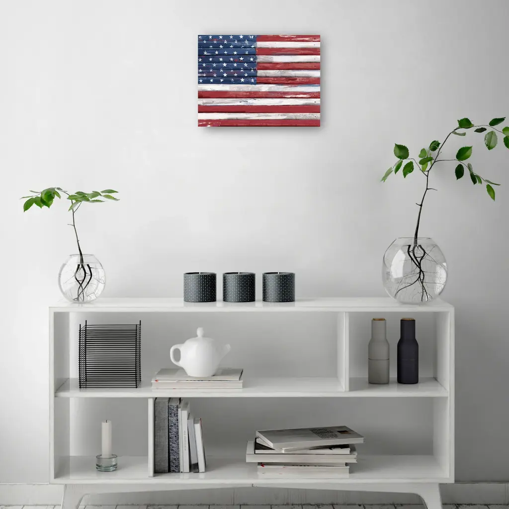 Shiplap Allegiance I by Studio Arts is produced with printing that covers the entirety of the canvas for a sleek and stylish museum-quality look. Our framed prints are made by expert craftsmen who strive to make each canvas the masterpiece that your home deserves. Each of our framed canvas art prints is hand-crafted and made-to-order to give it a high quality and professional appearance. To ensure the clearest, most accurate depiction of the artists' original vision, we print each work of art on bright white polyester canvas, ensuring the most vivid display and precise details. Please note: colors may differ slightly due to variation in monitors. READY TO HANG - Our canvas prints come with preinstalled D-rings attached to the back of the product to make hanging and displaying your new masterpiece a breeze.
