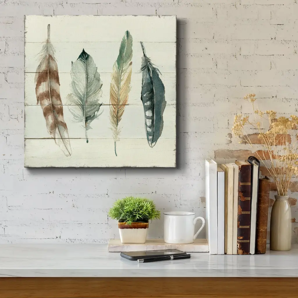 Shiplap Feathers I-Premium Gallery Wrapped Canvas - Ready to Hang A premium hand stretched gallery wrapped canvas print created to last. Featuring a beveled a solid wood stretcher bar, each piece comes ready to hand 5 SIZES AVAILABLE 10''X10'' - Overall Size 16''x16'' - Overall Size 24''x24'' - Overall Size 32''x32'' - Overall Size 40''x40'' - Overall Size Each piece is made to order. Built to Last Each piece comes ready to hang Solid wood stretcher Fade and Water resistant Made domestically
