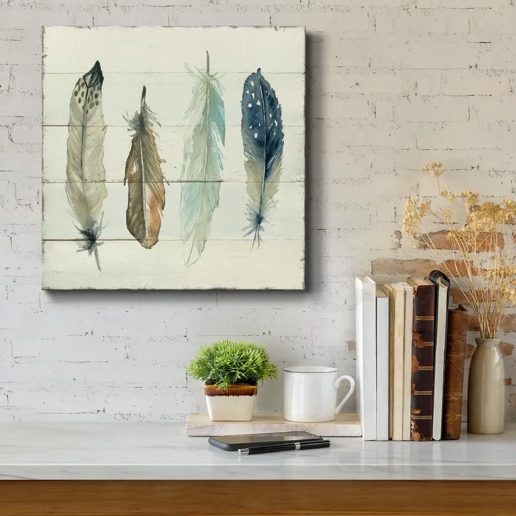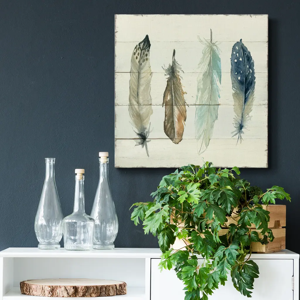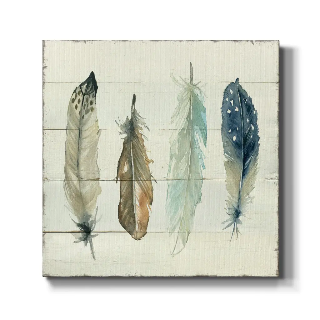 Shiplap Feathers II-Premium Gallery Wrapped Canvas - Ready to Hang A premium hand stretched gallery wrapped canvas print created to last. Featuring a beveled a solid wood stretcher bar, each piece comes ready to hand 5 SIZES AVAILABLE 10''X10'' - Overall Size 16''x16'' - Overall Size 24''x24'' - Overall Size 32''x32'' - Overall Size 40''x40'' - Overall Size Each piece is made to order. Built to Last Each piece comes ready to hang Solid wood stretcher Fade and Water resistant Made domestically