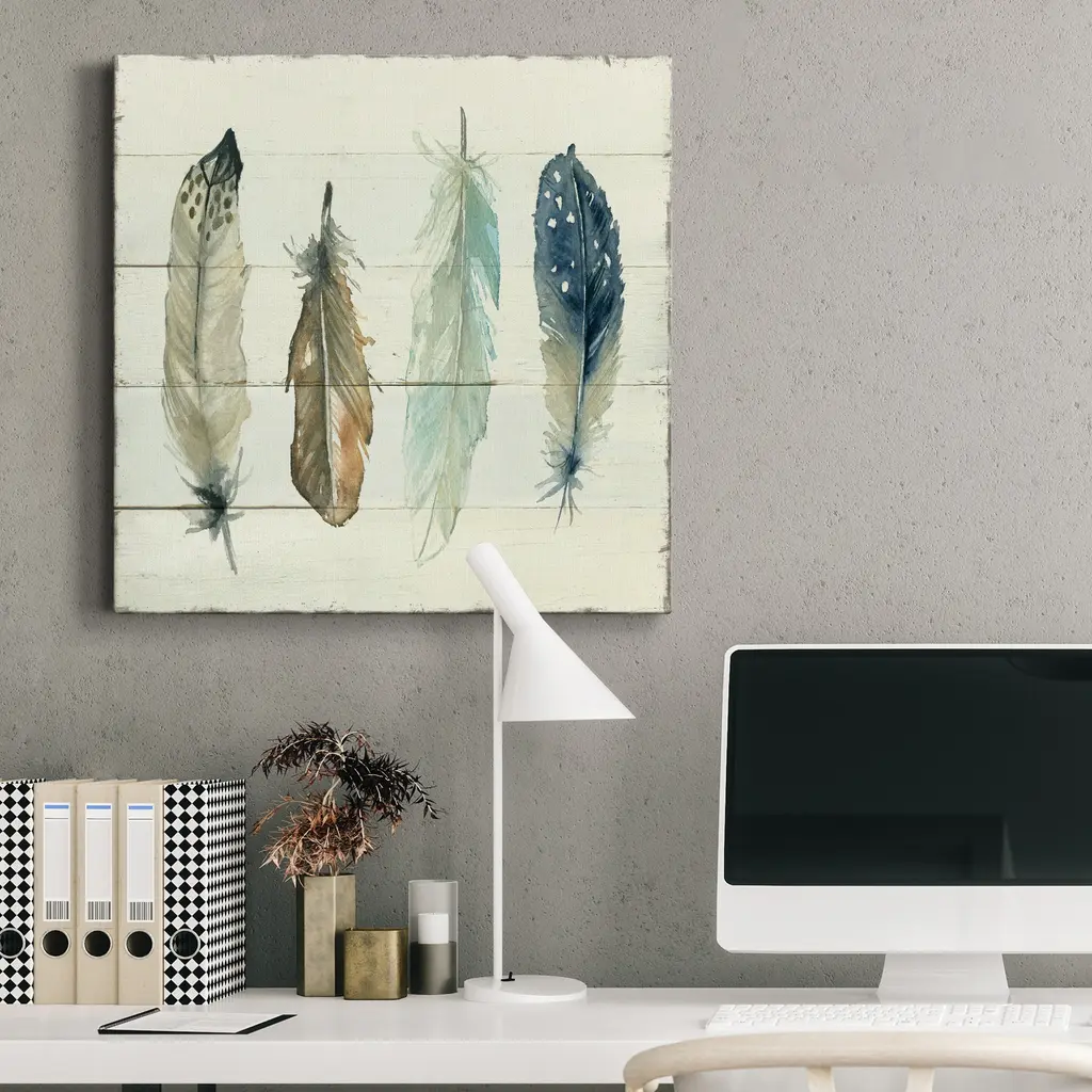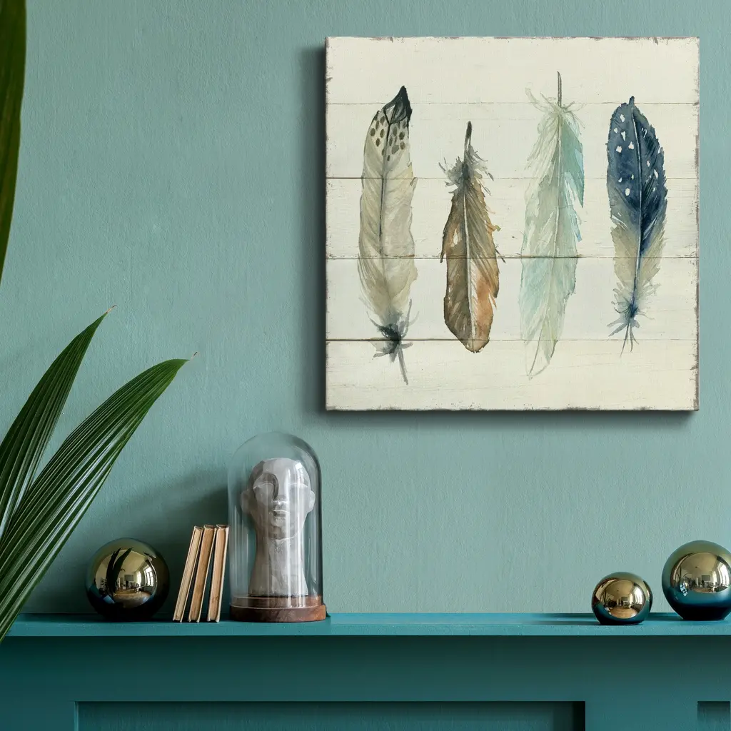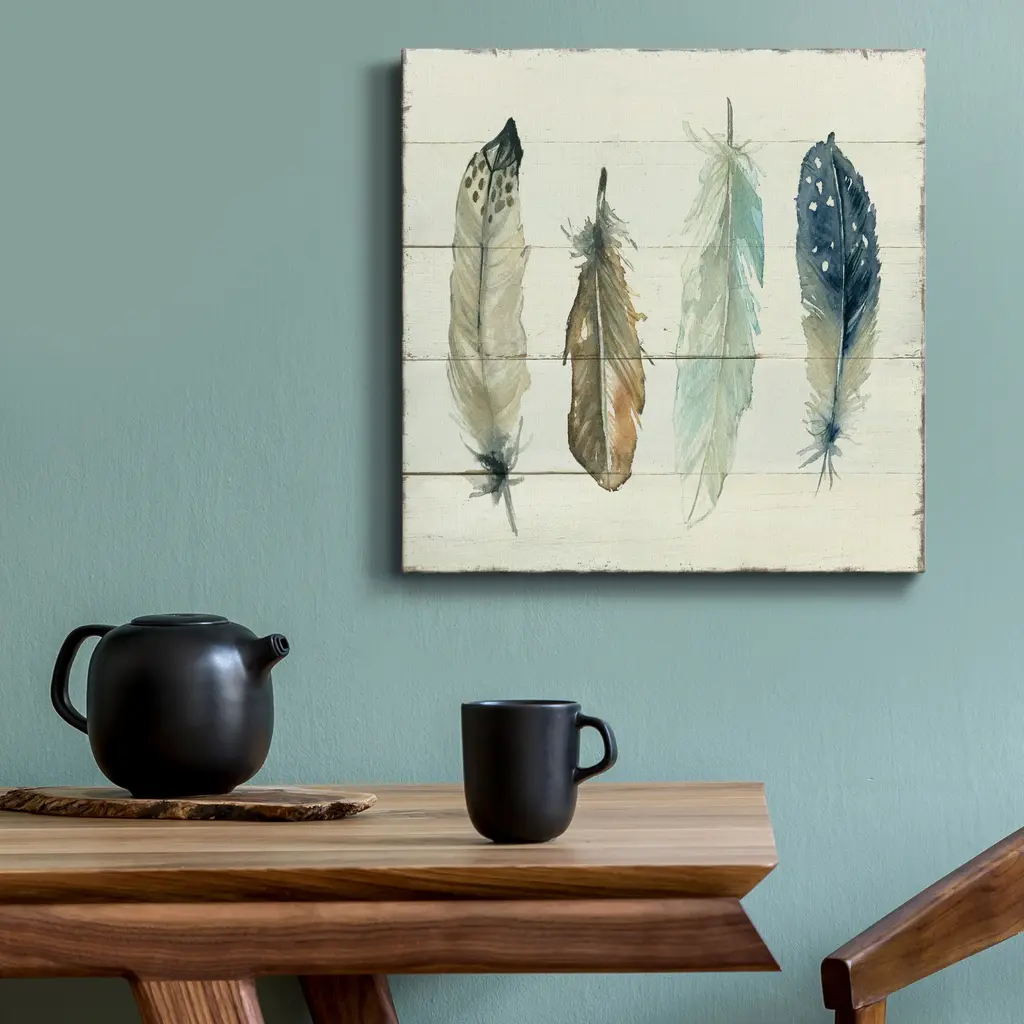 Shiplap Feathers II-Premium Gallery Wrapped Canvas - Ready to Hang A premium hand stretched gallery wrapped canvas print created to last. Featuring a beveled a solid wood stretcher bar, each piece comes ready to hand 5 SIZES AVAILABLE 10''X10'' - Overall Size 16''x16'' - Overall Size 24''x24'' - Overall Size 32''x32'' - Overall Size 40''x40'' - Overall Size Each piece is made to order. Built to Last Each piece comes ready to hang Solid wood stretcher Fade and Water resistant Made domestically