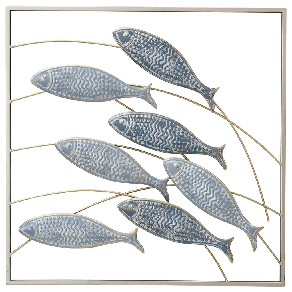 Framed and ready to hang, this joyful piece celebrates fish in nature. Moving upward as they are carried by the shoal, fish are depicted as they move together as they ride the current. Made by hand with attention to detail. With incised and raised metal-tooling, individual fish are crafted with lines, dots and contrasting paint that create distinct character. Framed, this well sized piece measures as follows: 19.75 x 19.75 inches (50.0 L x 3.0 W x 50.0 H cm). This square piece has a low profile of 1.5 inches from the wall. Ideal for decorating seaside and coastal themed homes.Easy to hang loops are located on the back. A sturdy armature connects the fish that offers gold glints and the feeling of the water between them.