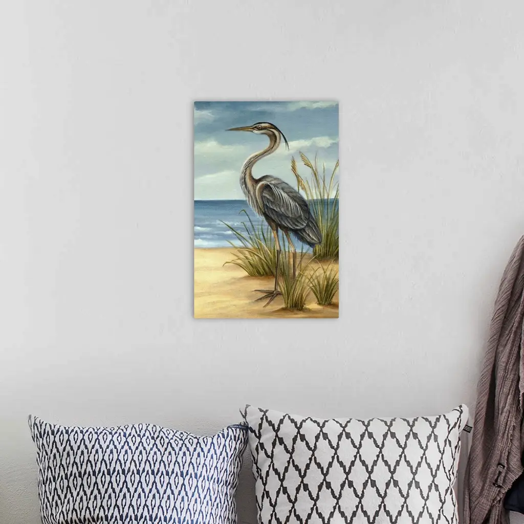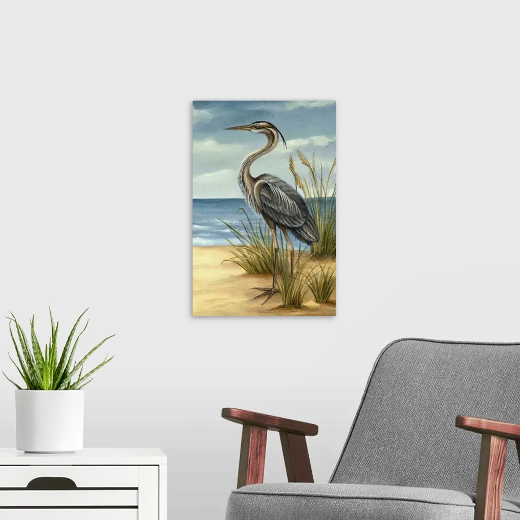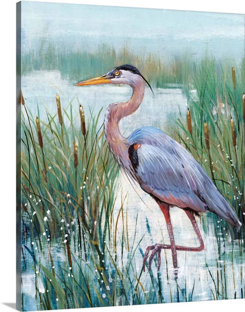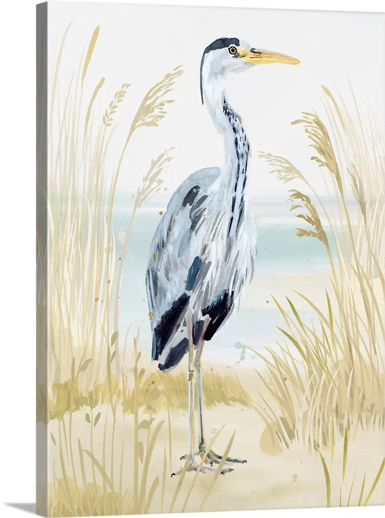 Image of a tall heron standing among clumps of sea grass. This traditional painting is reminiscent of the work of John James Audubon, and would be the perfect accent piece in any traditional, transitional or coastal setting.