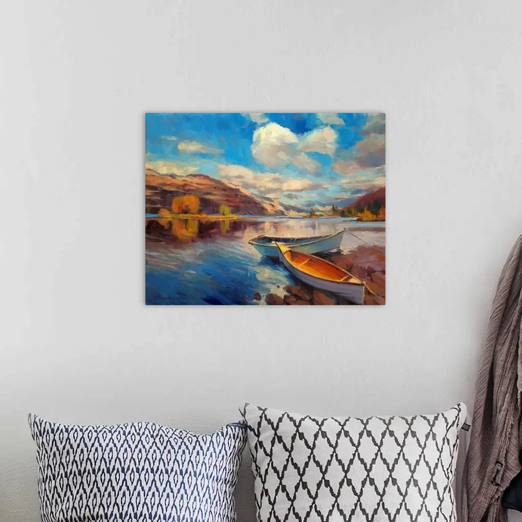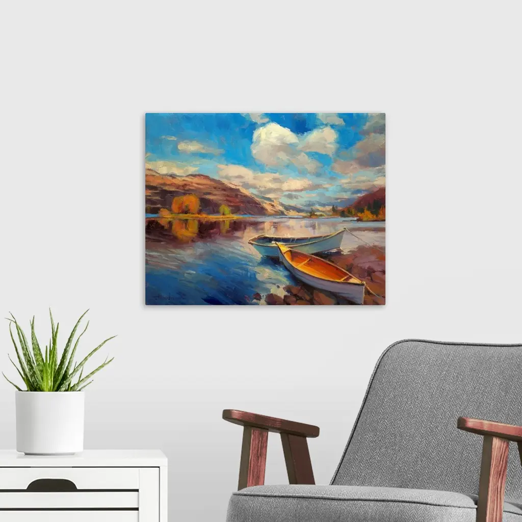 Traditional representational painting of rowboats along the bank of a peaceful blue river