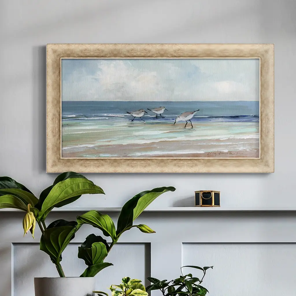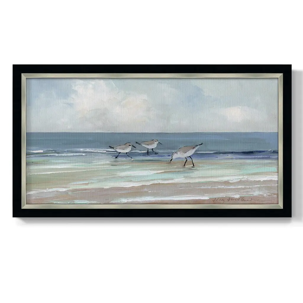 Shore Searching I Premium Framed Canvas- Ready to Hang A Premium Framed Canvas created to last. Framed in distressed wood and available in an array of sizes and colors Featuring a beveled a solid wood stretcher bar, each piece comes ready to hand 3 SIZES AVAILABLE 21''X37'' - Overall Size 25''X45'' - Overall Size 29''x53'' - Overall Size Each piece is made to order. Each piece comes with hanging hardware. Made in the USA Ready to Hang Giclee Paper Print Acrylic Glass Beveled Matt Board