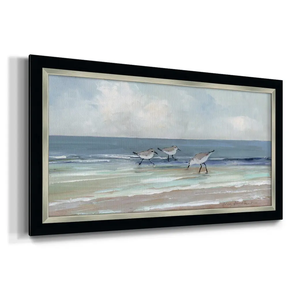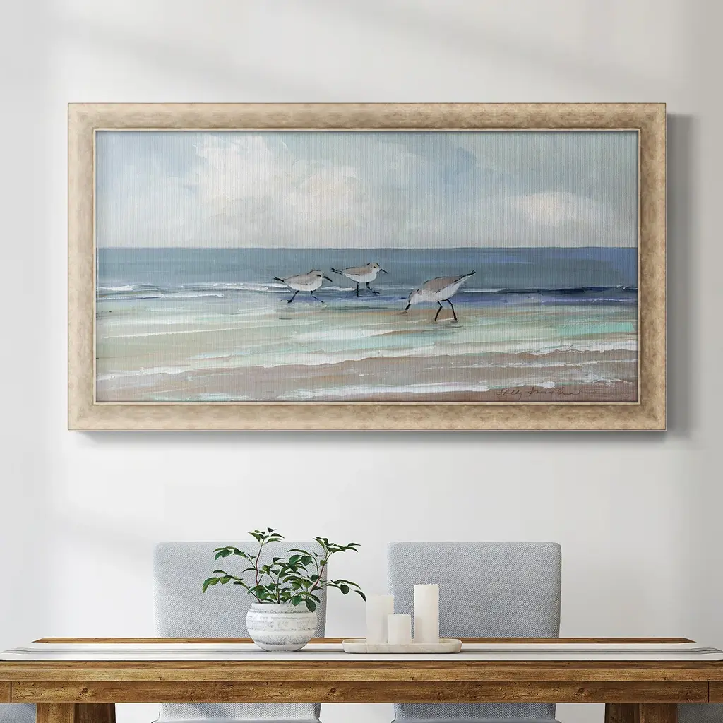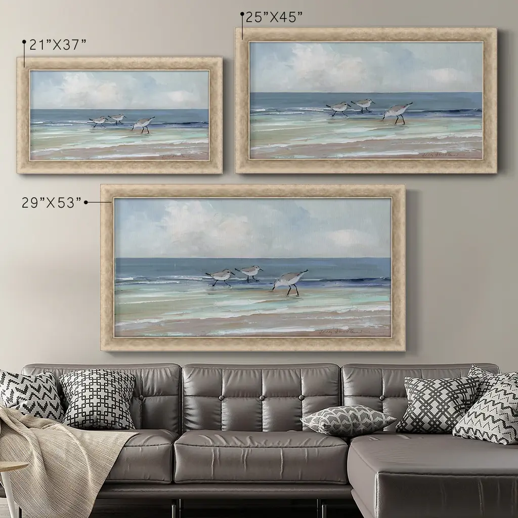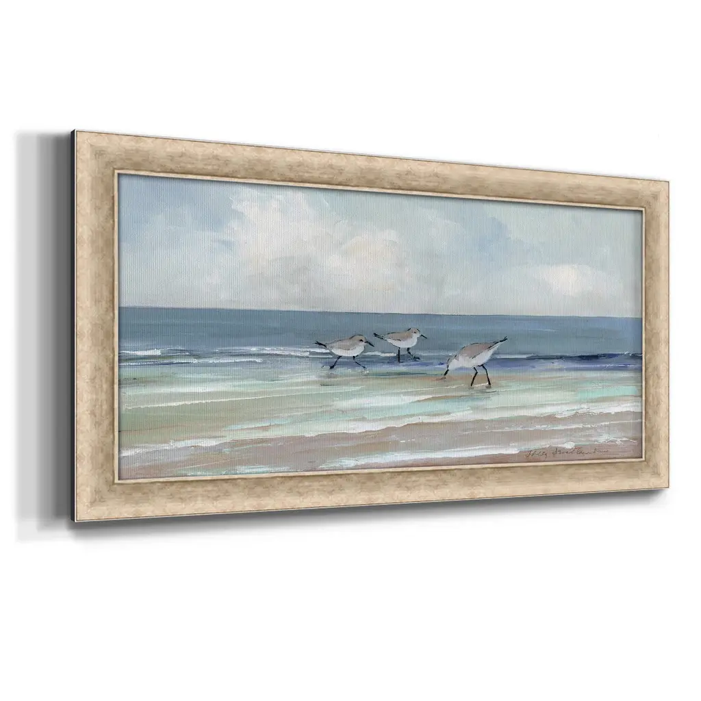 Shore Searching I Premium Framed Canvas- Ready to Hang A Premium Framed Canvas created to last. Framed in distressed wood and available in an array of sizes and colors Featuring a beveled a solid wood stretcher bar, each piece comes ready to hand 3 SIZES AVAILABLE 21''X37'' - Overall Size 25''X45'' - Overall Size 29''x53'' - Overall Size Each piece is made to order. Each piece comes with hanging hardware. Made in the USA Ready to Hang Giclee Paper Print Acrylic Glass Beveled Matt Board