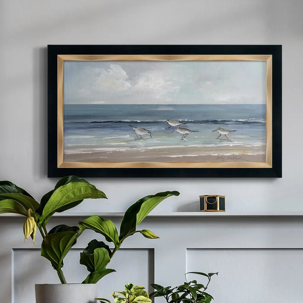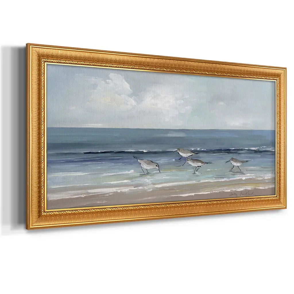 Shore Searching II Premium Framed Canvas- Ready to Hang A Premium Framed Canvas created to last. Framed in distressed wood and available in an array of sizes and colors Featuring a beveled a solid wood stretcher bar, each piece comes ready to hand 3 SIZES AVAILABLE 21''X37'' - Overall Size 25''X45'' - Overall Size 29''x53'' - Overall Size Each piece is made to order. Each piece comes with hanging hardware. Made in the USA Ready to Hang Giclee Paper Print Acrylic Glass Beveled Matt Board
