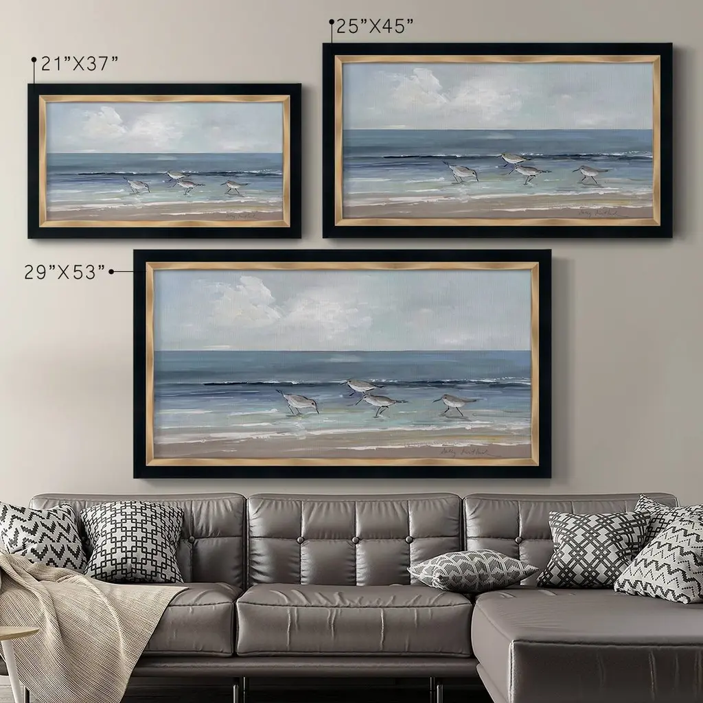 Shore Searching II Premium Framed Canvas- Ready to Hang A Premium Framed Canvas created to last. Framed in distressed wood and available in an array of sizes and colors Featuring a beveled a solid wood stretcher bar, each piece comes ready to hand 3 SIZES AVAILABLE 21''X37'' - Overall Size 25''X45'' - Overall Size 29''x53'' - Overall Size Each piece is made to order. Each piece comes with hanging hardware. Made in the USA Ready to Hang Giclee Paper Print Acrylic Glass Beveled Matt Board