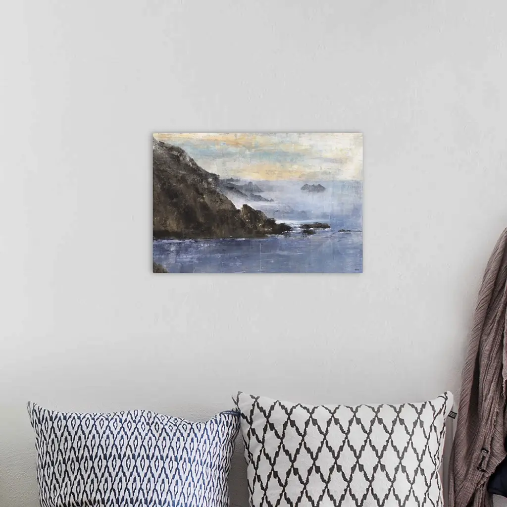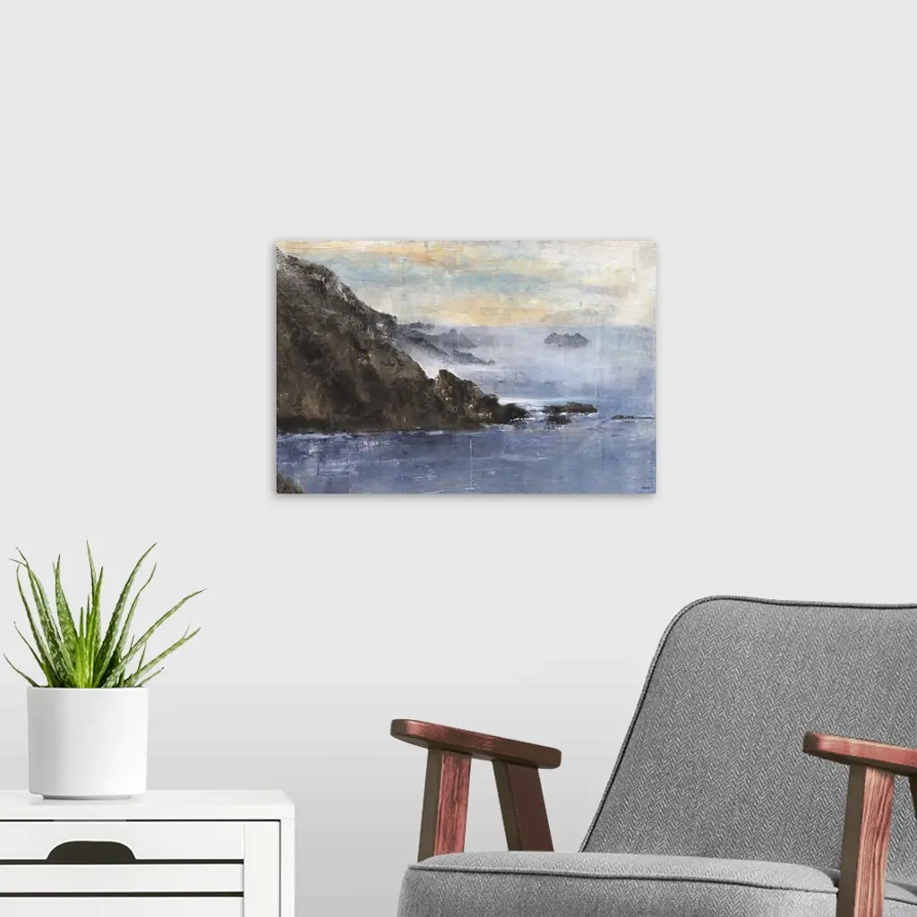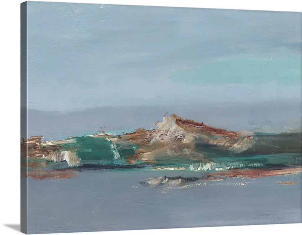 Contemporary landscape painting of blue water surrounded by rocky cliffs.