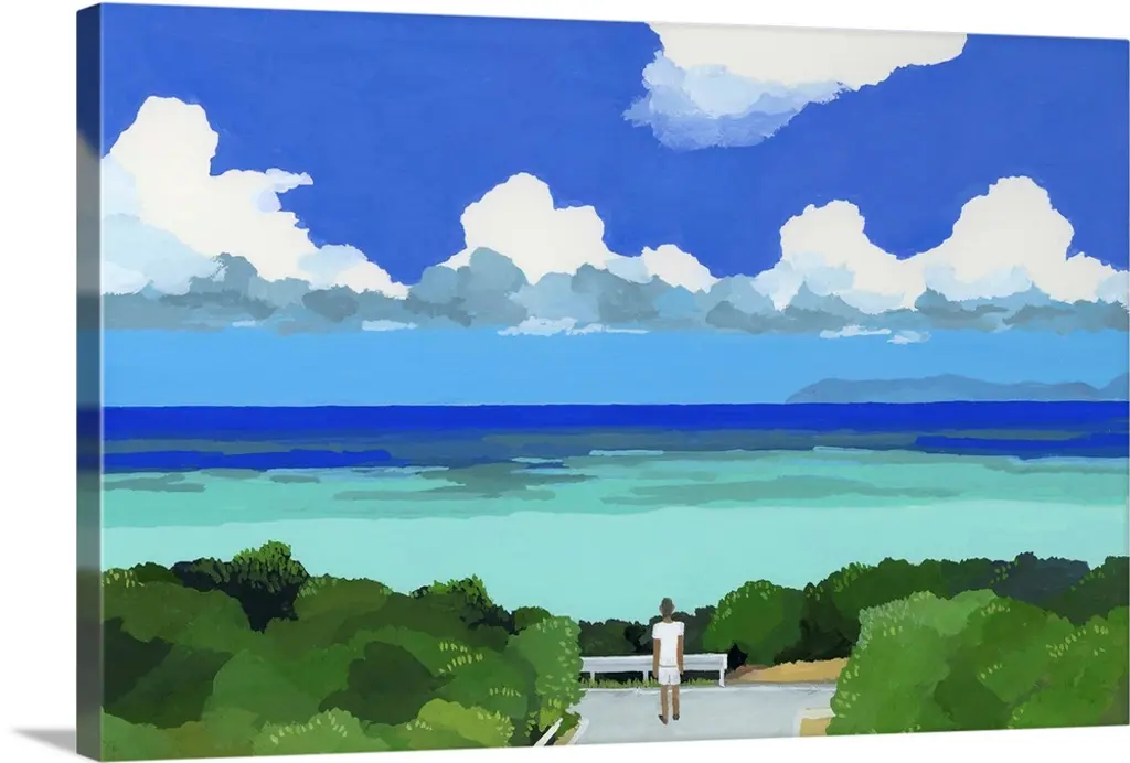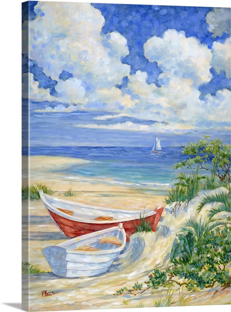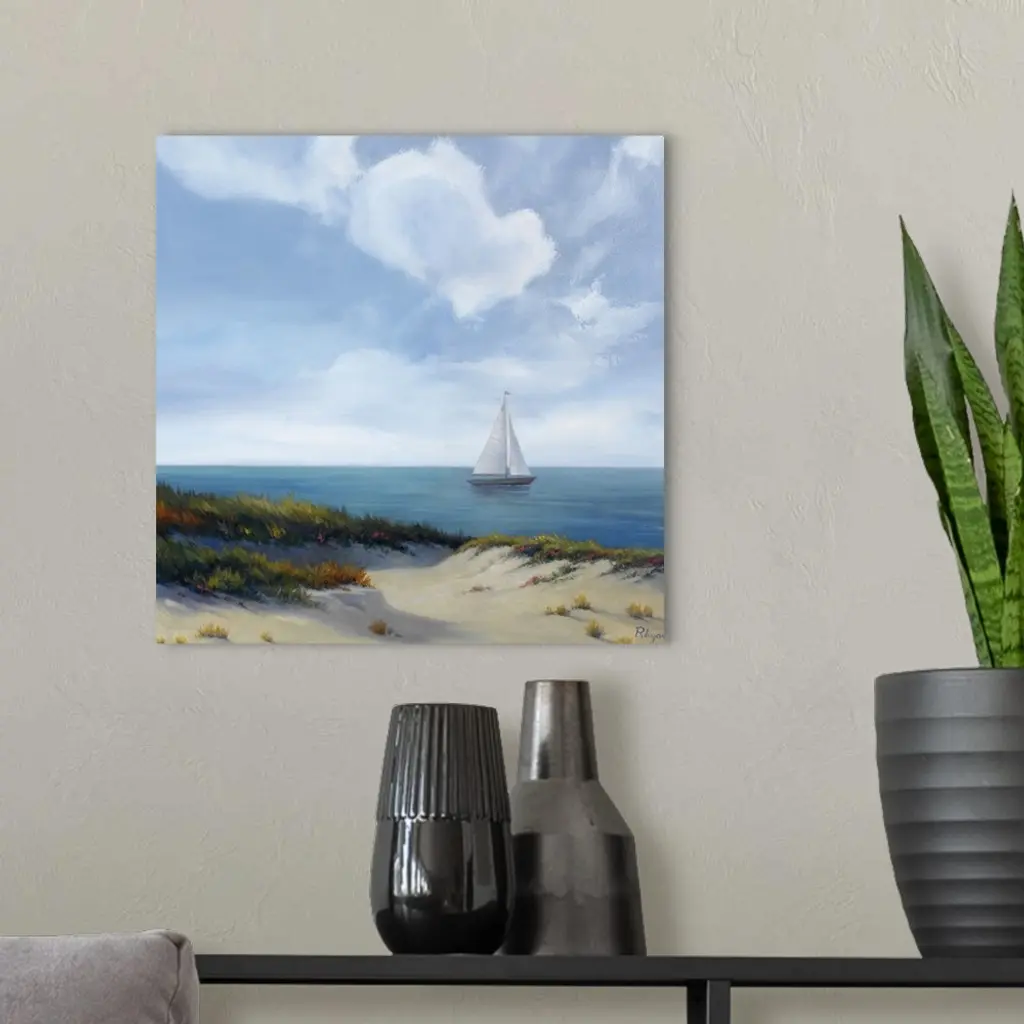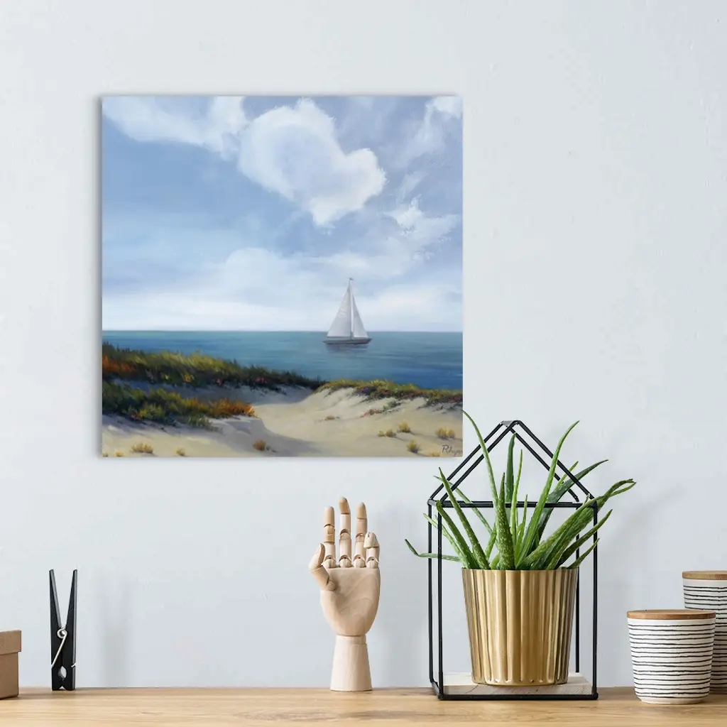 This is a square shaped painting by a contemporary artist of beach dunes covered with grass and sailboat gliding across a still sea.
