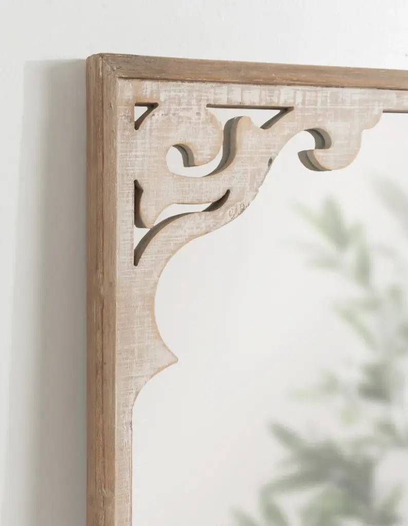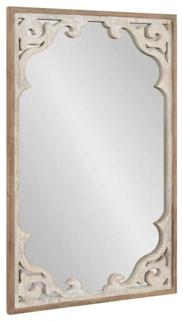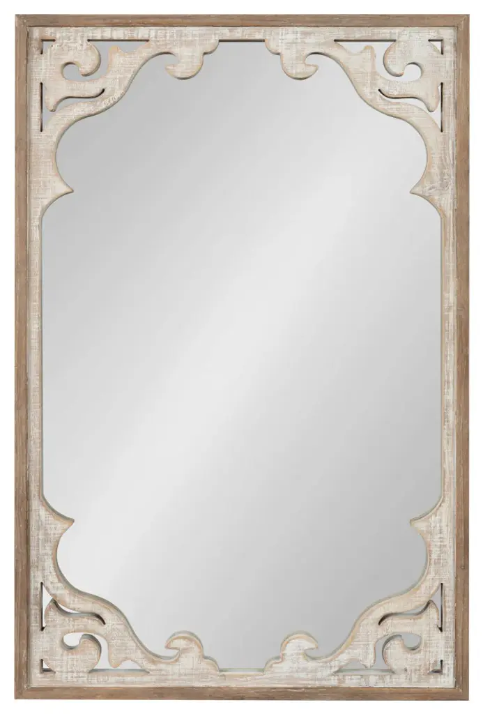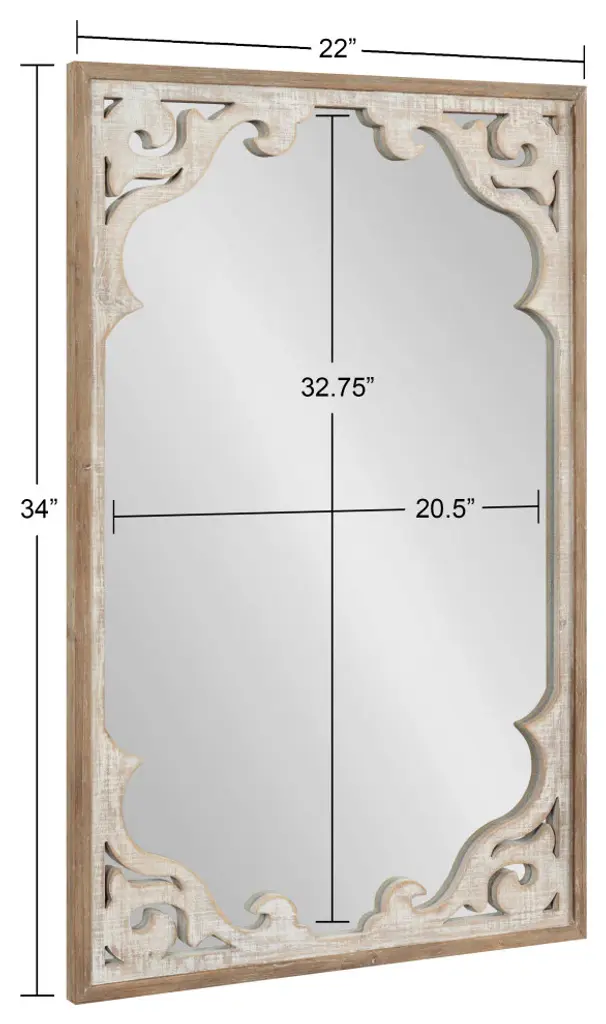 The Shovali mirror creates a bold and unique wall decor scheme with the rustic charm you crave. The Shovali features an ornate, wood-carved frame with delicate curves and intricate detailing to wow your guests. The whitewashed finish enhances its vintage farmhouse aesthetic and allows it to liven up your bold rustic room scheme. The mirror is perfect for acting as a unique focal point for your home decor, measuring 22" wide by 34" tall. The Shovali provides an accessible accent piece for your wall that adds value and looks fantastic on its own or in multiples for the perfect symmetrical wall display. Adding a mirror to your home expands your smaller spaces, opening up and bringing dimension to your home by reflecting light across the room. The Shovali Mirror looks great over a mantle or couch in the living room or above a console table in your entryway or dining room. Its rectangular shape and ample reflective surface make it an excellent bathroom vanity mirror in your powder room. Hang your new farmhouse decor easily, thanks to the secure D-ring hangers attached to the back.- Rustic Farmhouse Charm: Create an attractive farmhouse wall display scheme with the Shovali''s ornate 3D carved frame that draws the eye and creates a dynamic visual focal point- Vintage Finish: Wow your guests and create an antique-inspired look with the beautiful whitewashed finish on the Shovali''s frame - Ample Size: The Shovali is 22" wide by 34" deep and creates an elegant focal point in your home on its own or in multiples as a symmetrical wall display- Versatile: Hang the farmhouse-style Shovali mirror over the mantle or couch in your living room, over your bed in your master bedroom, or use it as a bathroom vanity mirror for a cozy bathroom decor scheme- Easy to Hang: To hang the Shovali mirror with the rest of your wall decor, use the metal D-ring hangers conveniently attached to the back of the frame