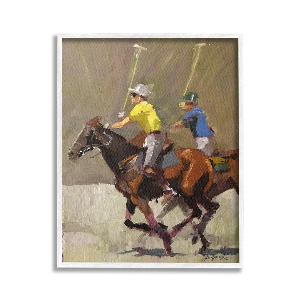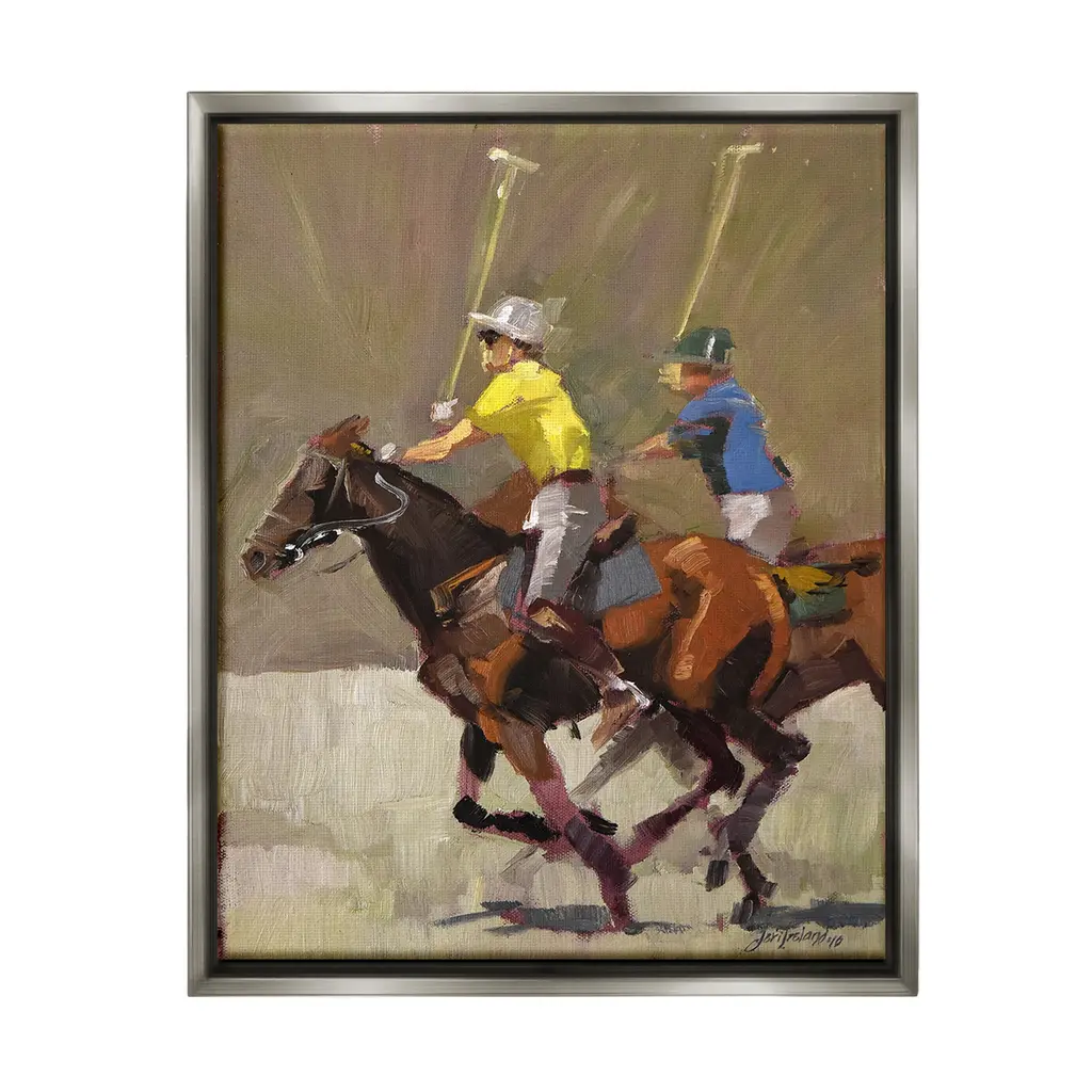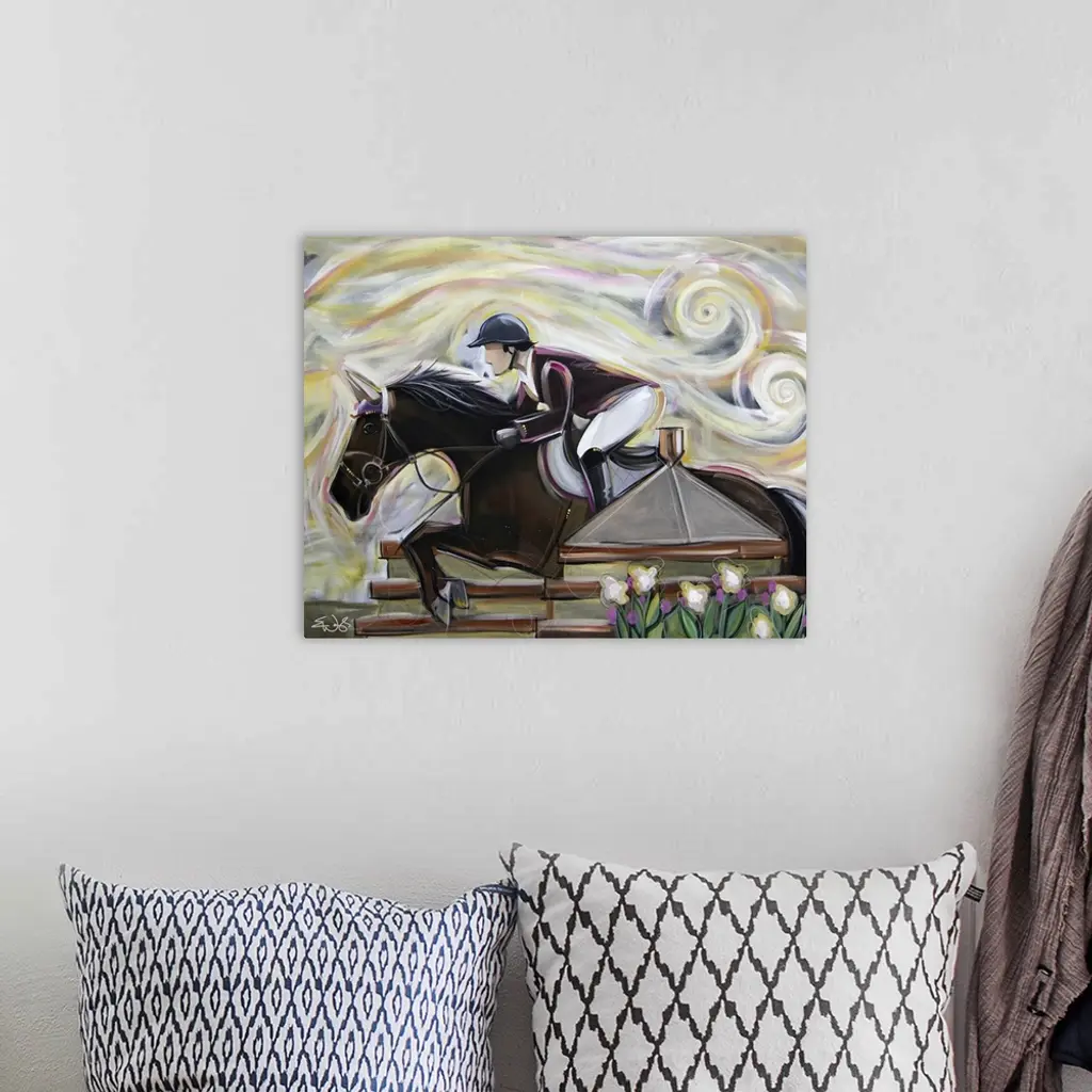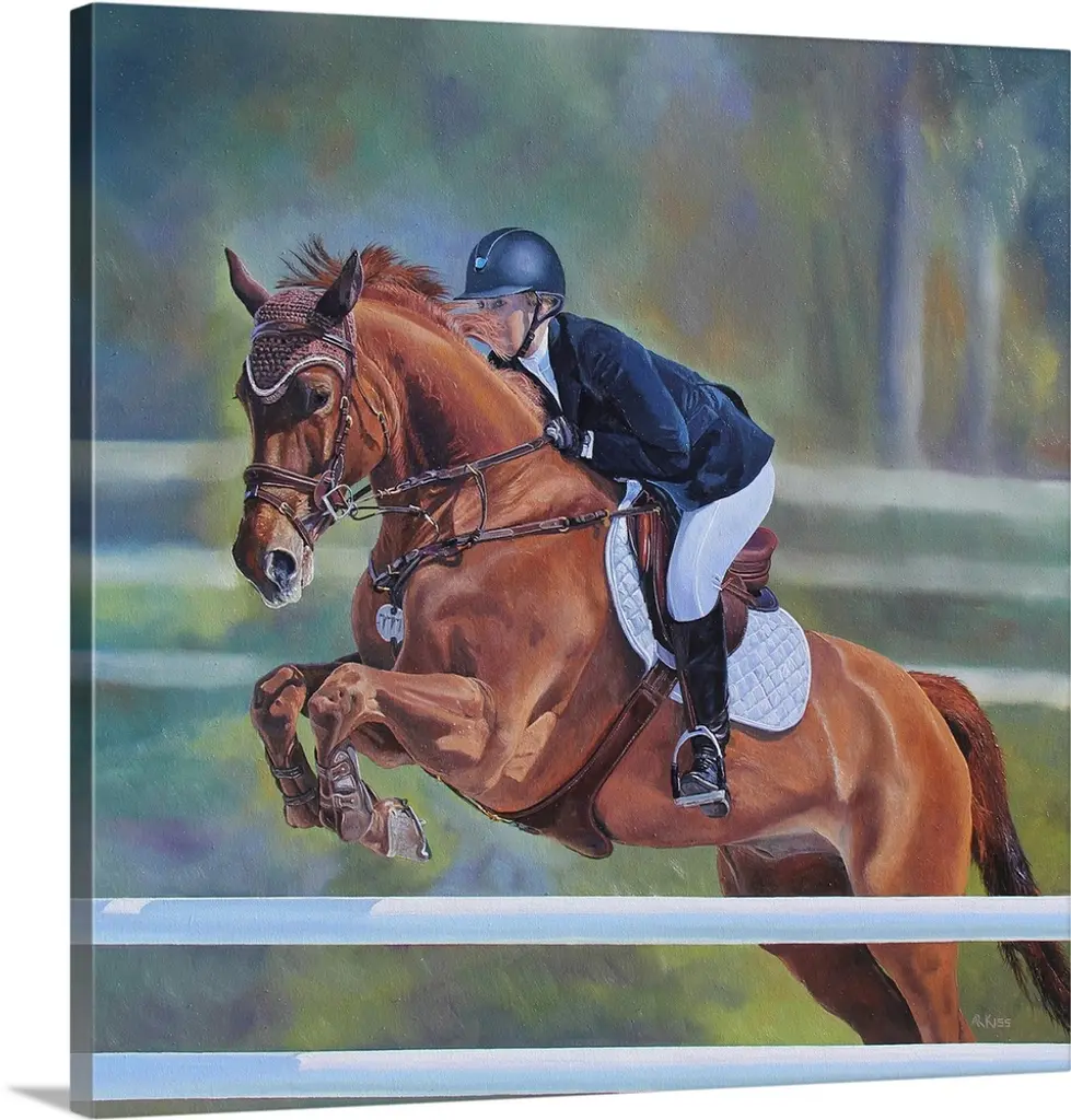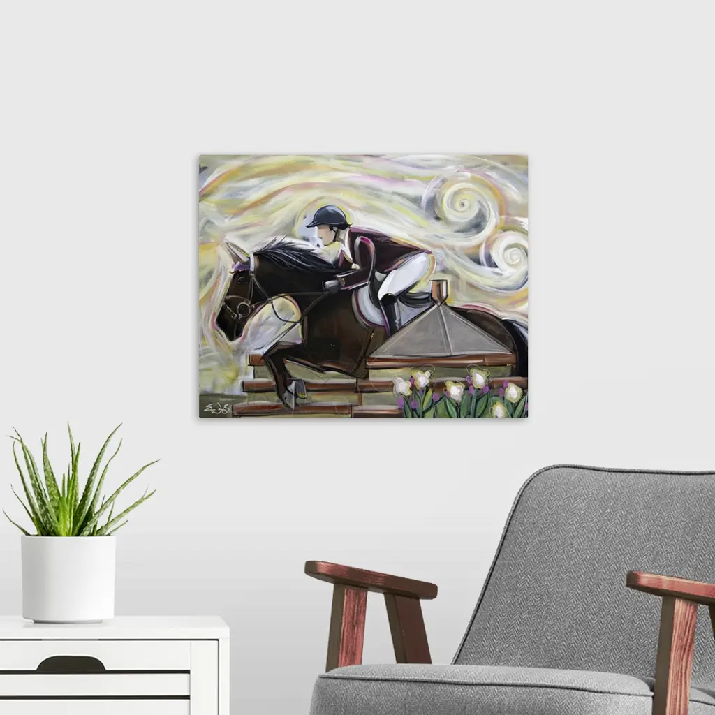Contemporary painting of a rider jumping a black horse over a decorative hurdle.