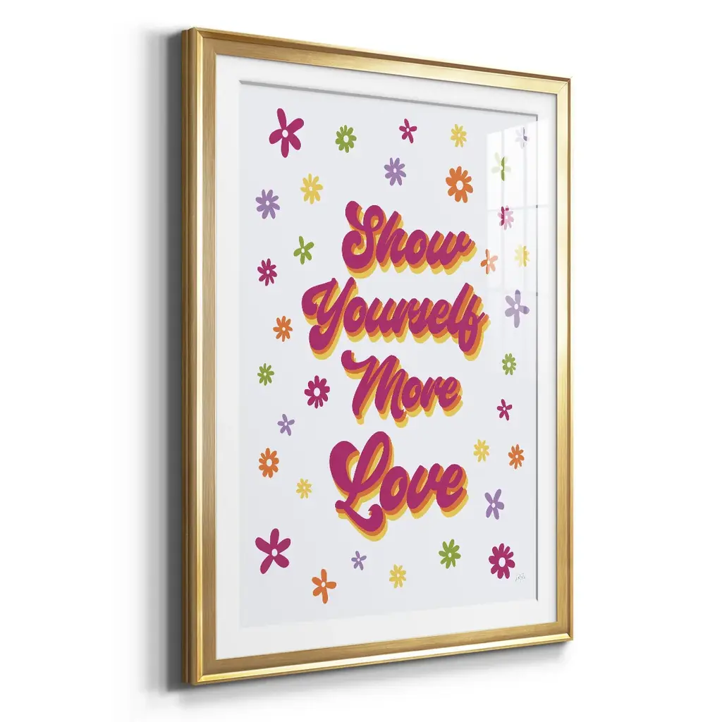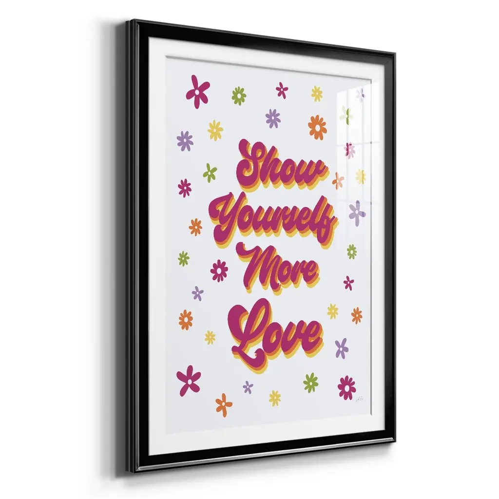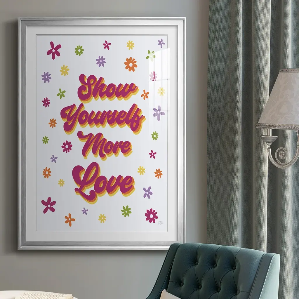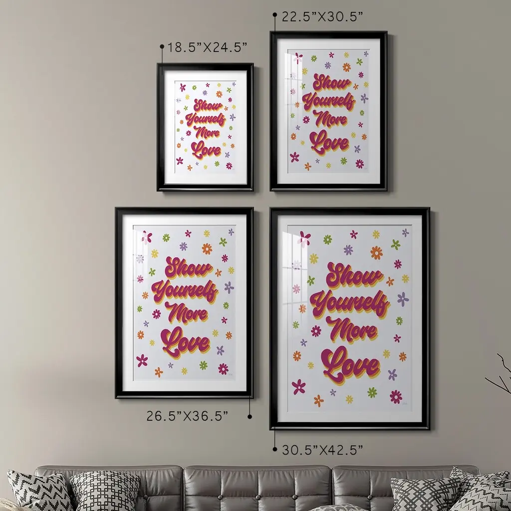 Show Yourself More Love Premium Framed Print - Ready to Hang A Premium Framed Print created to last. Framed in distressed wood and available in an array of sizes and colors Featuring a beveled a solid wood stretcher bar, each piece comes ready to hand 4 SIZES AVAILABLE 30.5''X42.5'' - Overall Size 26.5'X36.5'' - Overall Size 22.5''x30.5'' - Overall Size 18.5''x24.5'' - Overall Size Each piece is made to order. Each piece comes with hanging hardware. Made in the USA Ready to Hang Giclee Paper Print Acrylic Glass Beveled Matt Board