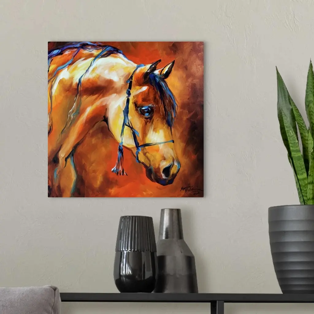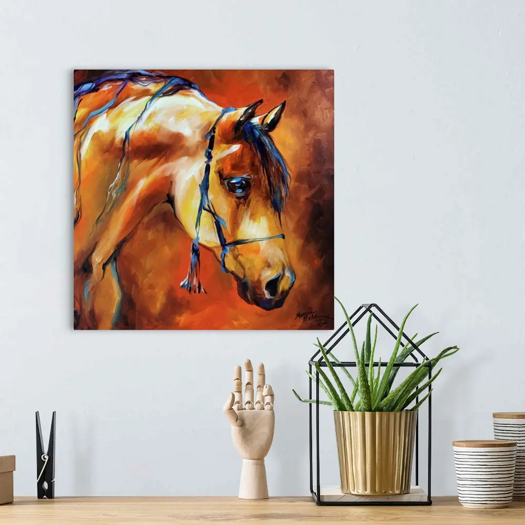 Square painting of the Arabian Show Halter Horse in warm hones with some blue hair on its mane.