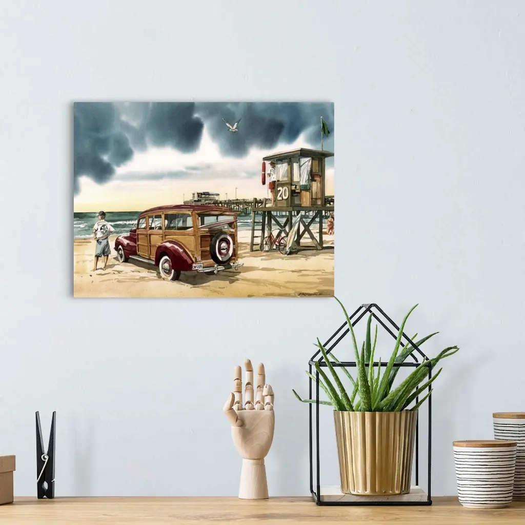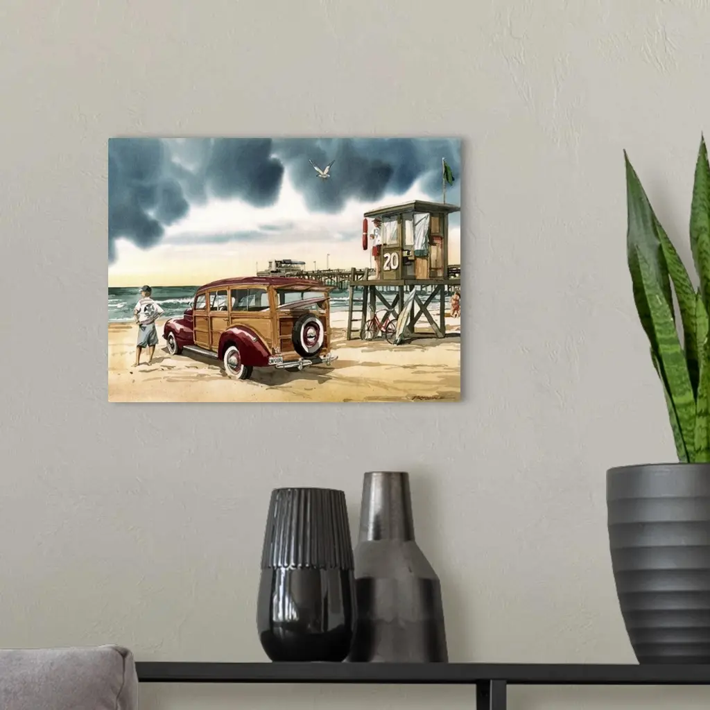 Watercolor painting of an overcast day at Newport Beach, CA with a woodie wagon parked on the beach.