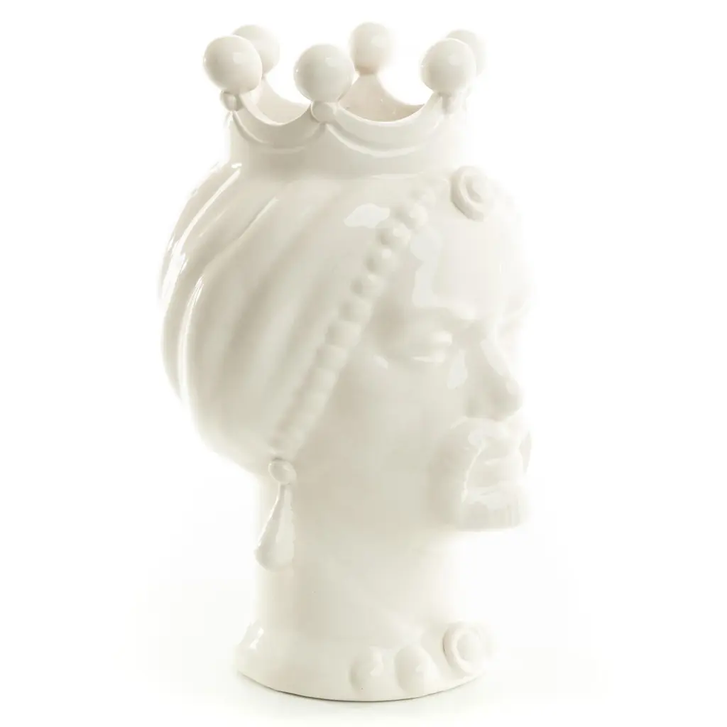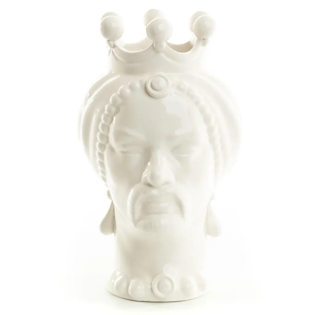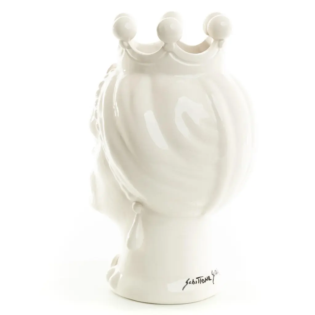 DESCRIPTION Schittone Moorish Head is handmade and painted in Italy, referred as Teste Di Moro. This piece can be used as a planter, vase or stunning piece of art. The legend of the Moorish head goes back in the XI century, during the Moors domination in Sicily and as in most legends, is once again Cupid’s fault (or credit). One day, a beautiful and honorable young girl living in the Kalsa, the arabic district of Palermo, was taking care of plants and flowers in the balcony of her house as she was used to. Suddenly, a Moor merchant who was passing by, fell in love with the beautiful girl who immediately returned his love. They started having a love story until when she discovered he already had a wife and children waiting for him in his native land. She went suddenly crazy of jealousy and one night, while he was sleeping she thought of a way to make him stay with her forever! She therefore cut off his head and used it as a vase to grow her beautiful basil plant. People walking by her balcony started looking at her flourishing plant of basil and became jealous of how bloomed her plants were, so they commissioned the potters in Palermo to forge colourful clay heads pots wishing to have the same magic green thumb. ARTISAN STORY The brothers Schittone, Vincenzo and Giuseppe, opened their artistic workshop in 2002 in Sciacca, a beautiful coastal town overlooking the sea in Sicily. Born in Sciacca, they attended the state institute of art "G. Bonachia “. As true artisans in hand-crafted modeling and painting, the brothers are two of our most innovative ceramists. They create unique pieces such as Moor's heads and passionately promote Sciacca a city of Ceramic.