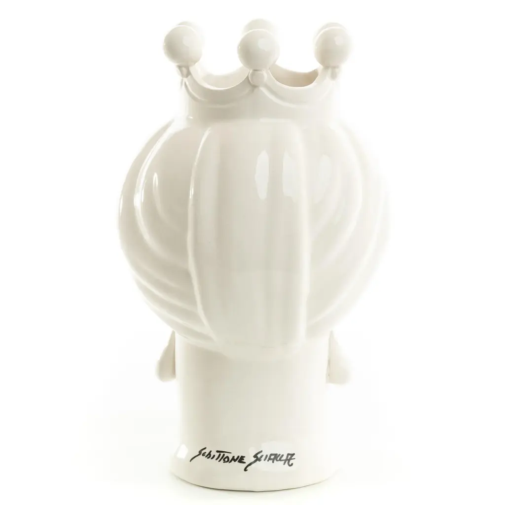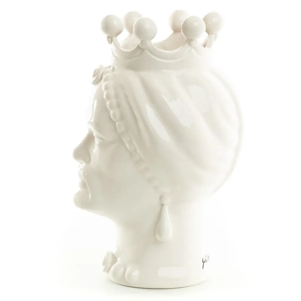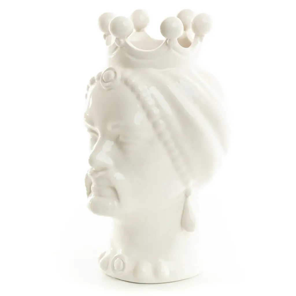 DESCRIPTION Schittone Moorish Head is handmade and painted in Italy, referred as Teste Di Moro. This piece can be used as a planter, vase or stunning piece of art. The legend of the Moorish head goes back in the XI century, during the Moors domination in Sicily and as in most legends, is once again Cupid’s fault (or credit). One day, a beautiful and honorable young girl living in the Kalsa, the arabic district of Palermo, was taking care of plants and flowers in the balcony of her house as she was used to. Suddenly, a Moor merchant who was passing by, fell in love with the beautiful girl who immediately returned his love. They started having a love story until when she discovered he already had a wife and children waiting for him in his native land. She went suddenly crazy of jealousy and one night, while he was sleeping she thought of a way to make him stay with her forever! She therefore cut off his head and used it as a vase to grow her beautiful basil plant. People walking by her balcony started looking at her flourishing plant of basil and became jealous of how bloomed her plants were, so they commissioned the potters in Palermo to forge colourful clay heads pots wishing to have the same magic green thumb. ARTISAN STORY The brothers Schittone, Vincenzo and Giuseppe, opened their artistic workshop in 2002 in Sciacca, a beautiful coastal town overlooking the sea in Sicily. Born in Sciacca, they attended the state institute of art "G. Bonachia “. As true artisans in hand-crafted modeling and painting, the brothers are two of our most innovative ceramists. They create unique pieces such as Moor's heads and passionately promote Sciacca a city of Ceramic.