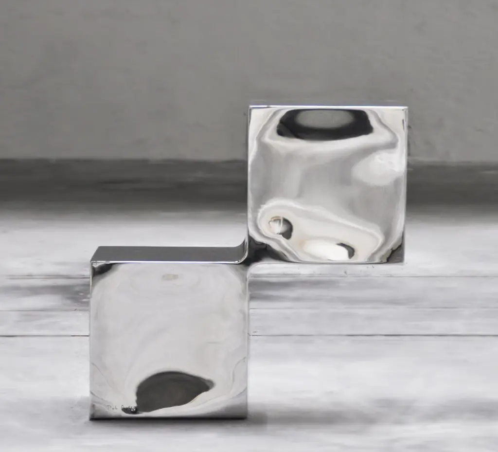 Side Cubes by Pol Quadens Limited Edition Of 24+4 Pieces.Dimensions: D 30 x W 60 x H 60 cm.Materials: Polished stainless steel.Pol Quadens was born in Brussels. His father was active in the fields of composites the metal industry, and the world of materials, therefore, surrounded Pol since his early childhood. After his artistic studies, he starts restoring vintage cars. This experience has allowed him to gain strong practical skills and a deep knowledge of all materials.In 1987, he made his first creations and production of objects. His sensitivity and passion for the arts led him to create functional artworks. His CD shelf has sold more than 100,000 pieces and has become iconic in its category.