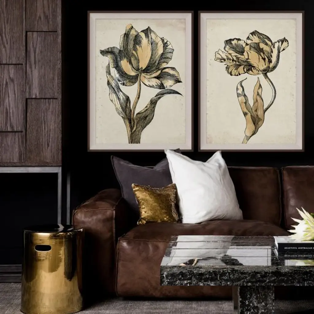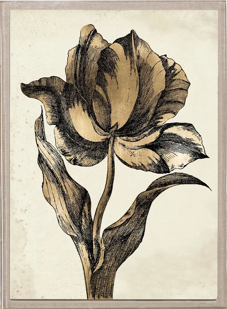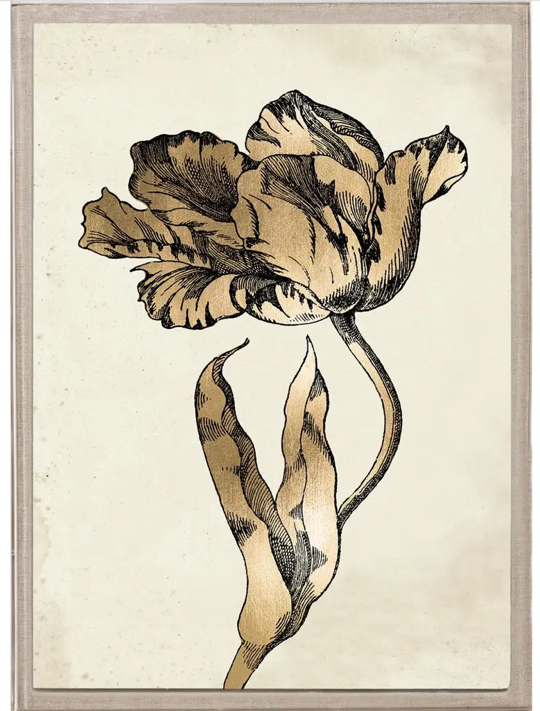 The striking color and ornate line work of the Sieger Tulips is the result of a harmonious collaboration inside the Natural Curiosities studio. Culled from a series of Viennese lithographs made in 1880 by botanical artist Eduard Sieger, these prints retain their old world charm while benefitting from the embellishments of our artists. Enlarged images are leafed in gold, then silkscreened to accentuate the shading and definitive outlines. The result brings dazzling opulence to these graceful studies.