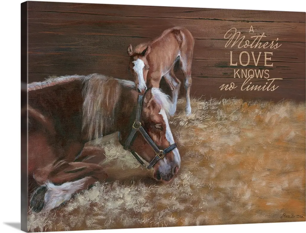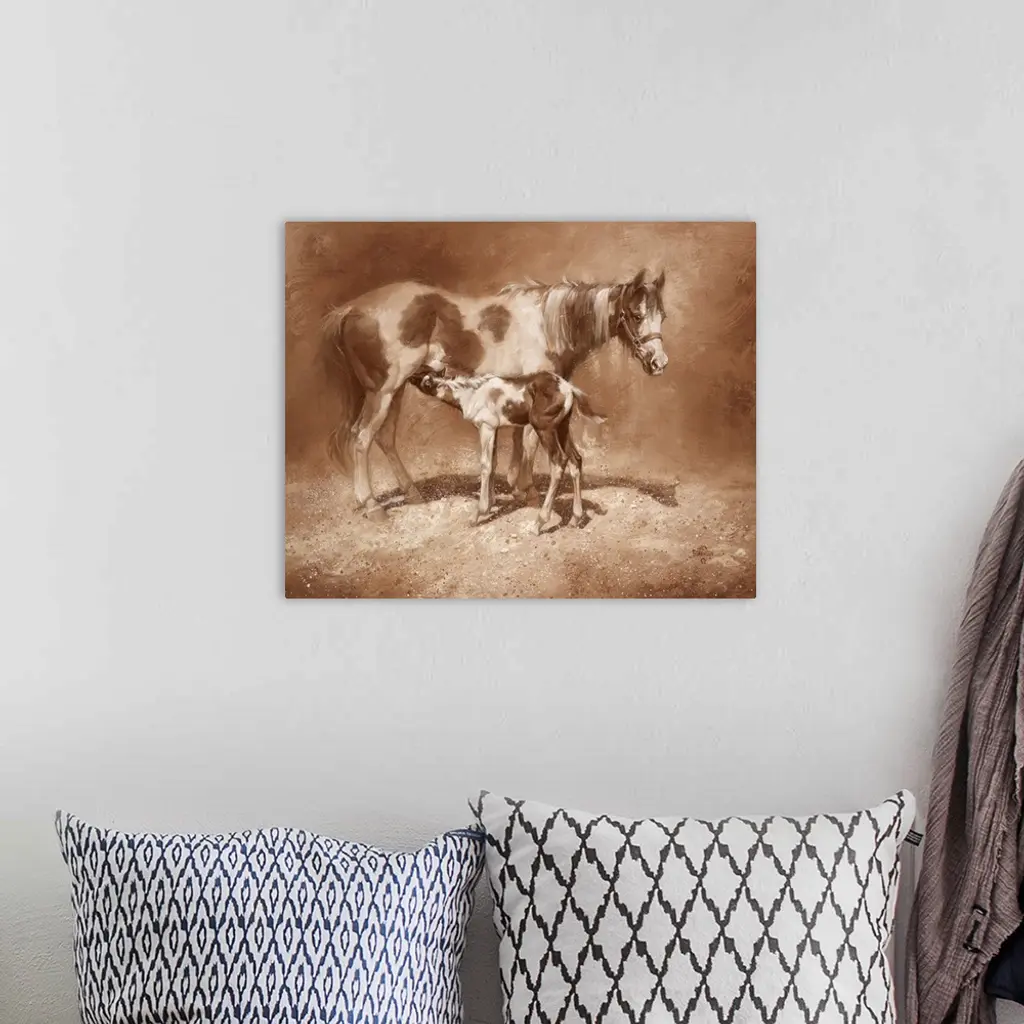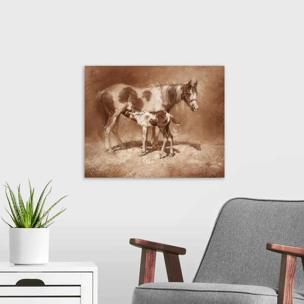 Energetic brush strokes and paint splatters create this brown toned artwork featuring a mother horse and her foal.