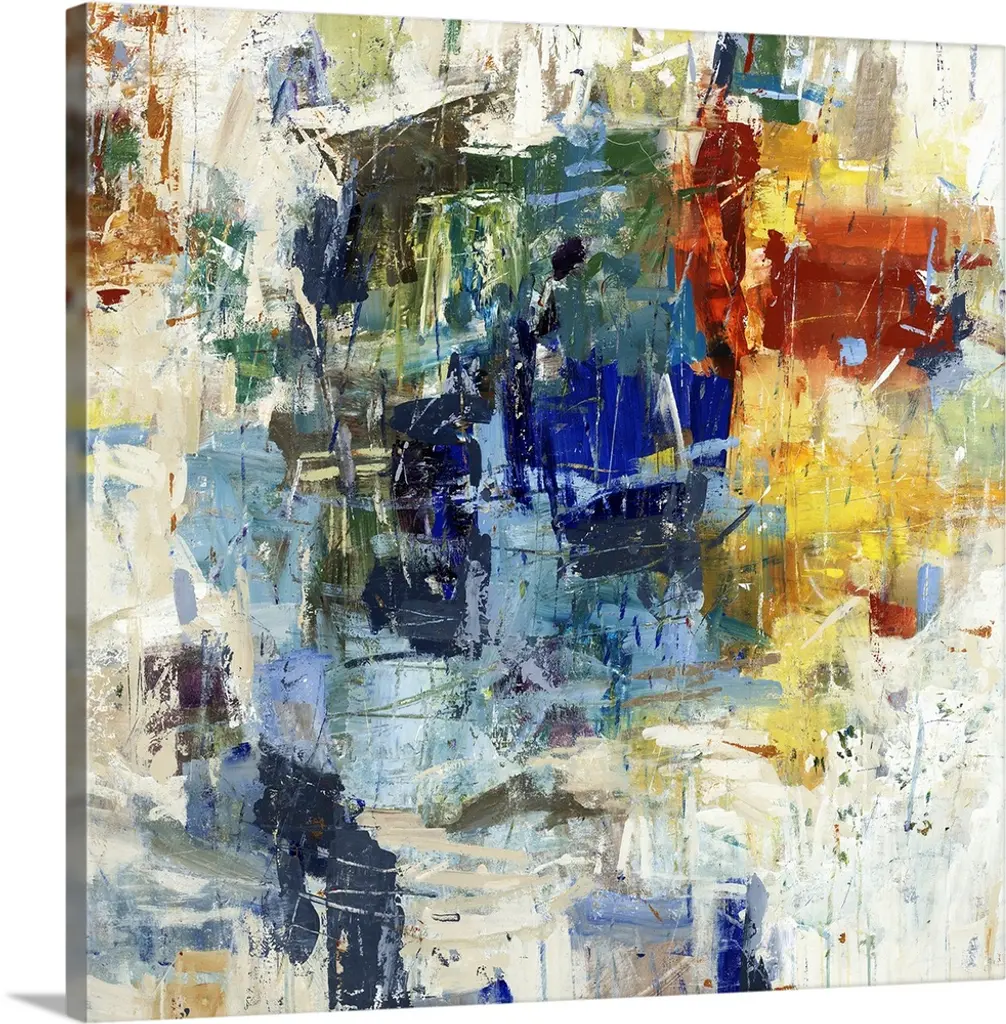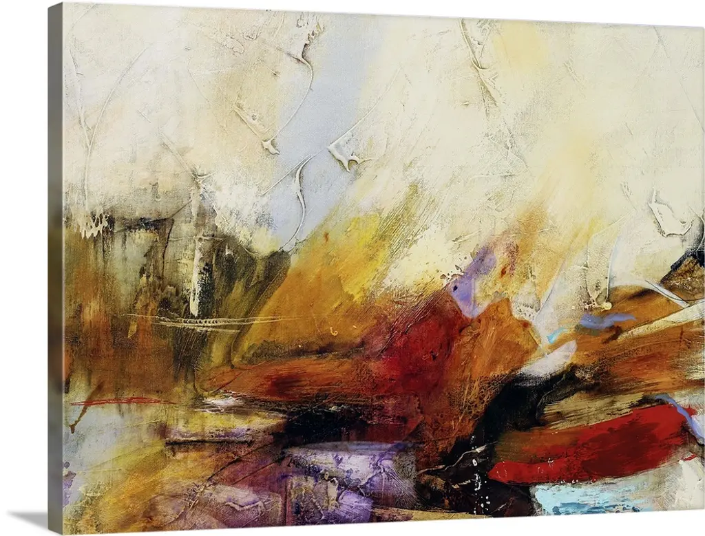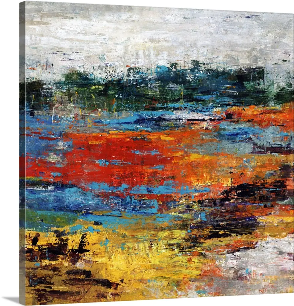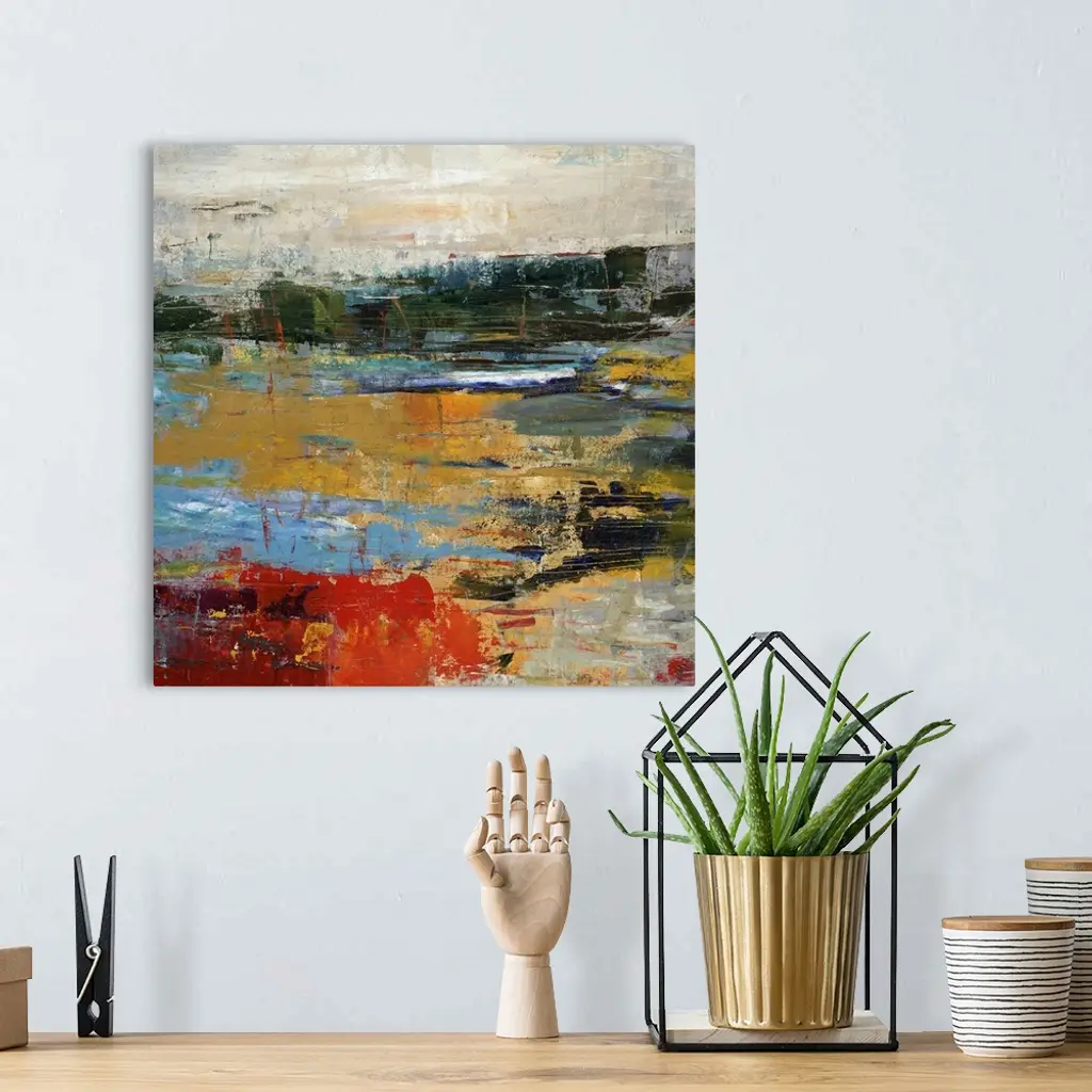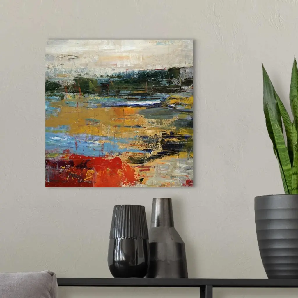 Abstract landscape painting of a golden sunset along a vibrant shoreline.