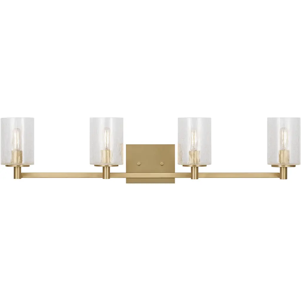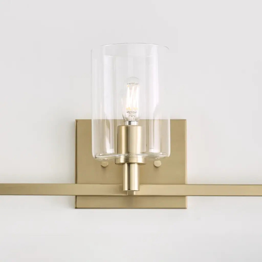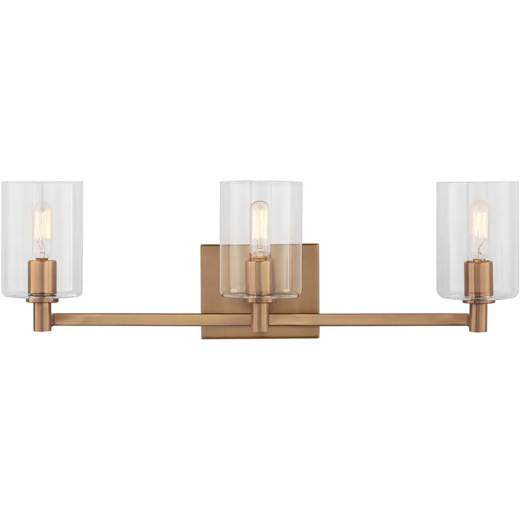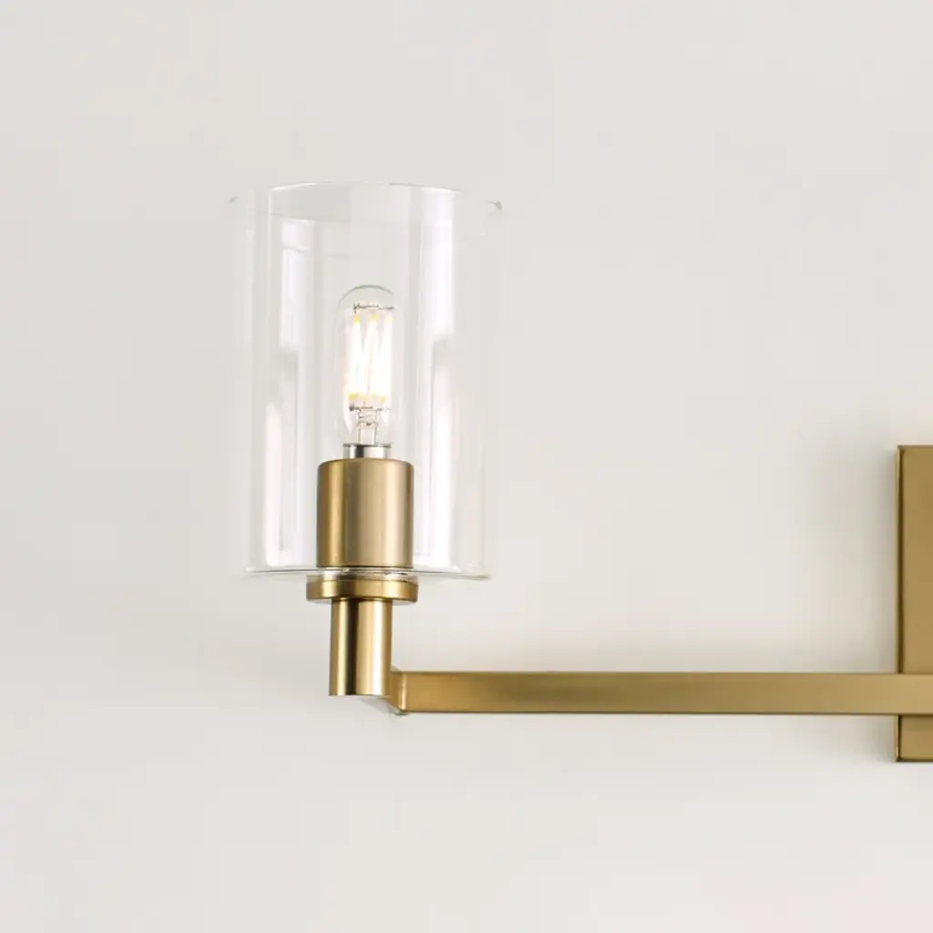 A subtle blend of straight lines + soft curves energizes this vanity light’s simple silhouette. The angular steel backplate is framed by three cylindrical shades of transparent glass. It’s compatible with a dimmer switch + suitable for damp spaces; add tubular bulbs to complete the balanced look.