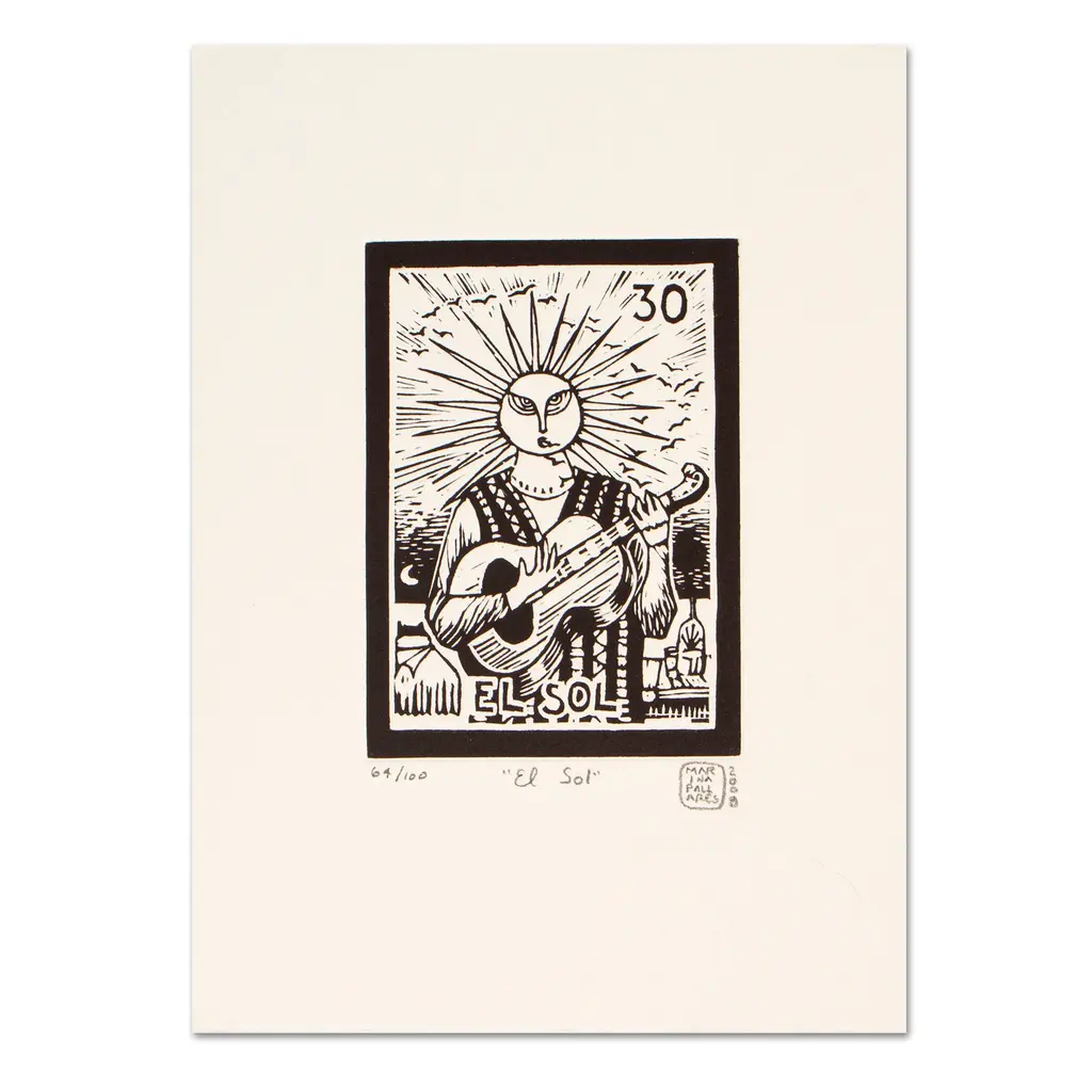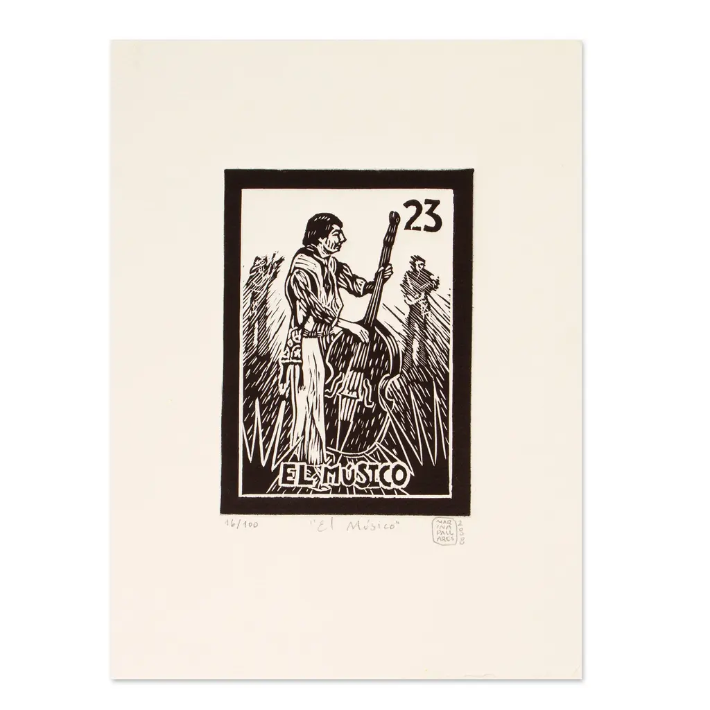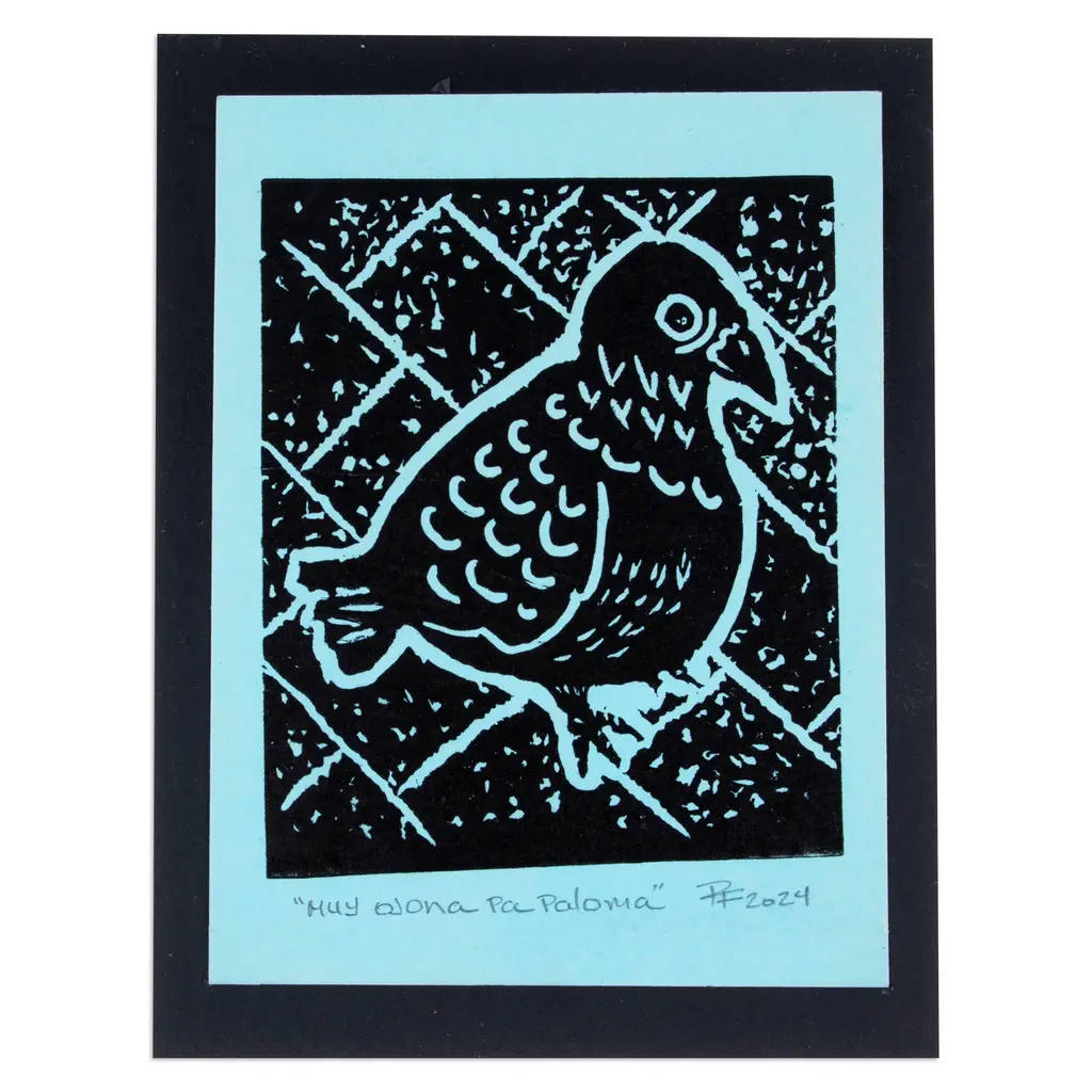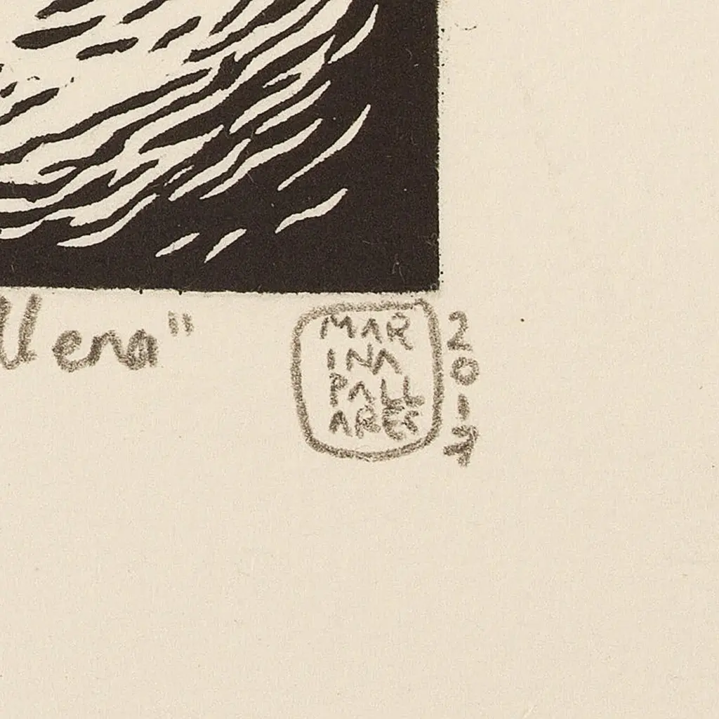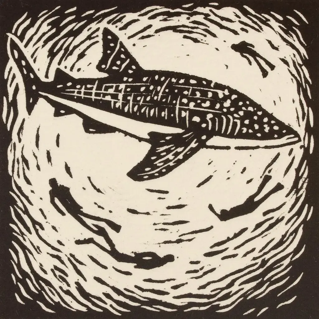 Swimmers in fins circle an impressive whale shark in the clear waters of the Mexican Caribbean. Marina Pallares depicts the dramatic scene in this small-scale linoleum block print. "Such an impressive shark! In addition to being absolutely beautiful, you can swim with them off the island of Holbox," the artist says. "This series of prints has been greatly influenced by my love for the Riviera Maya — my second home." Larger than many dinosaurs, the grey fish with its distinctive spots can measure as much as 40 feet long and weigh more than 15 tons. Fortunately for swimmers, it is essentially vegan. Tiled "Tiburón ballena" in Spanish.