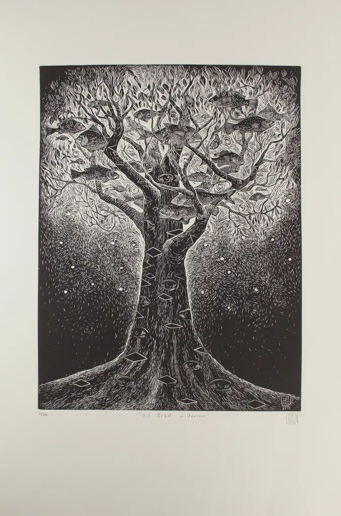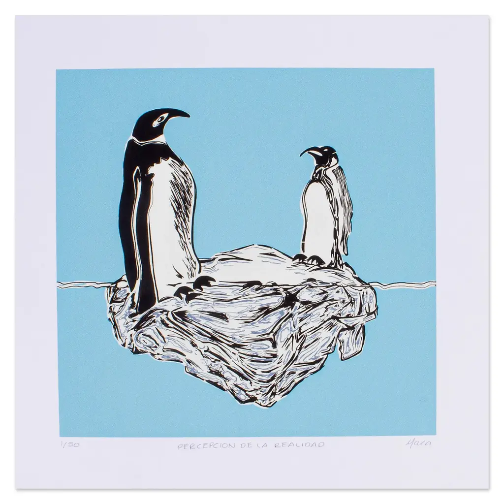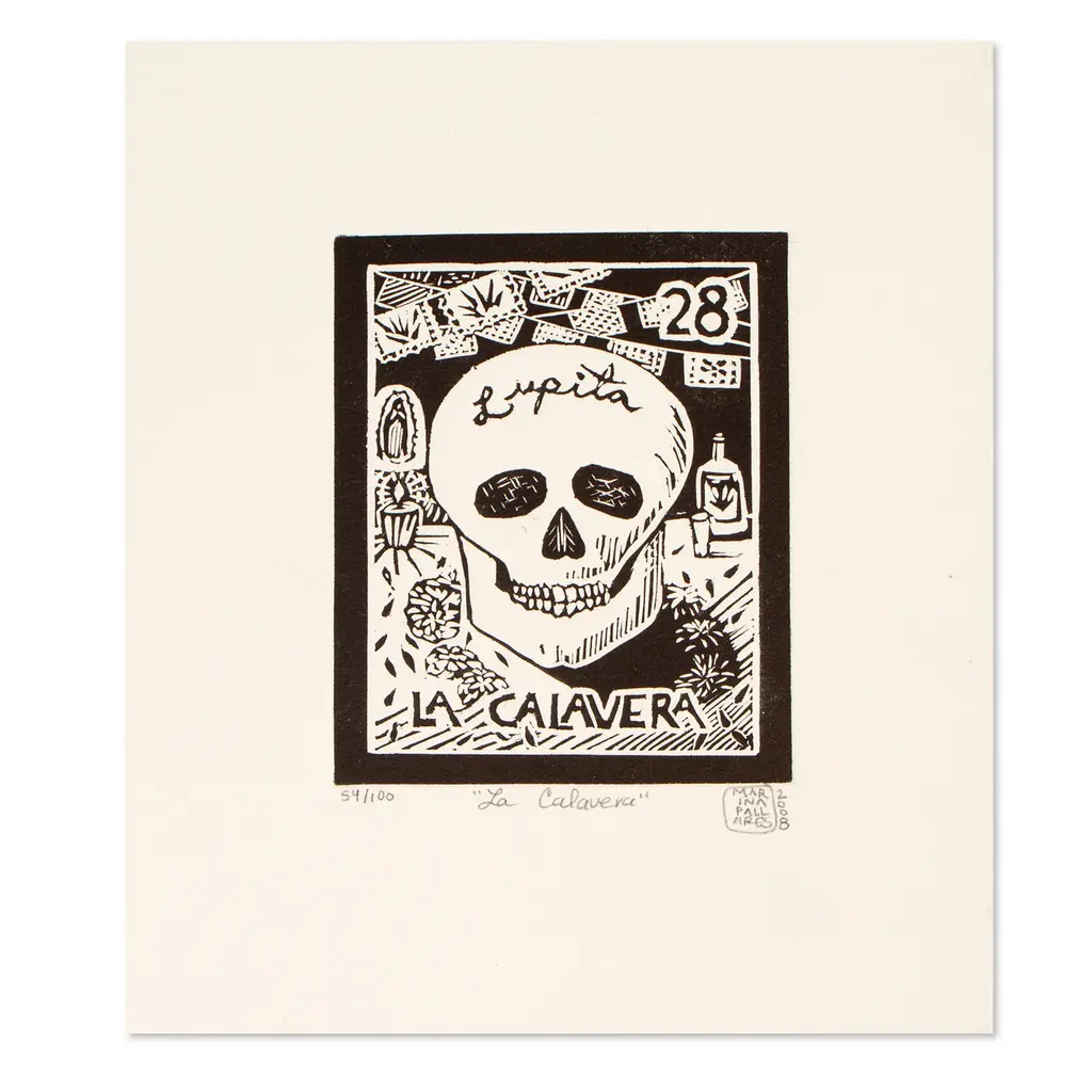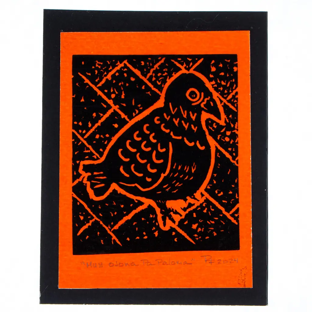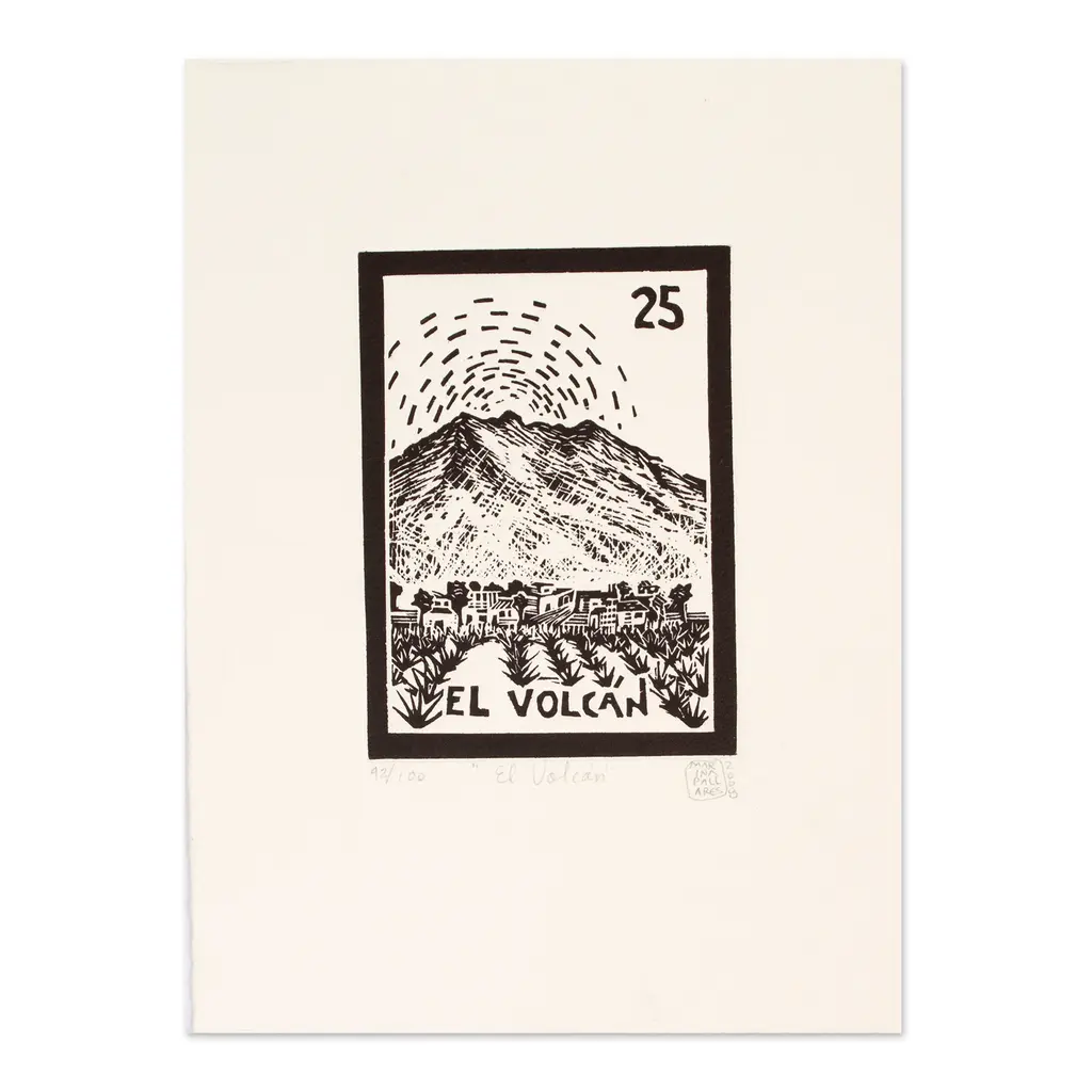 Swimmers in fins circle an impressive whale shark in the clear waters of the Mexican Caribbean. Marina Pallares depicts the dramatic scene in this small-scale linoleum block print. "Such an impressive shark! In addition to being absolutely beautiful, you can swim with them off the island of Holbox," the artist says. "This series of prints has been greatly influenced by my love for the Riviera Maya — my second home." Larger than many dinosaurs, the grey fish with its distinctive spots can measure as much as 40 feet long and weigh more than 15 tons. Fortunately for swimmers, it is essentially vegan. Tiled "Tiburón ballena" in Spanish.