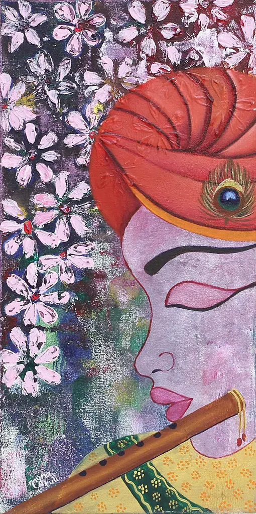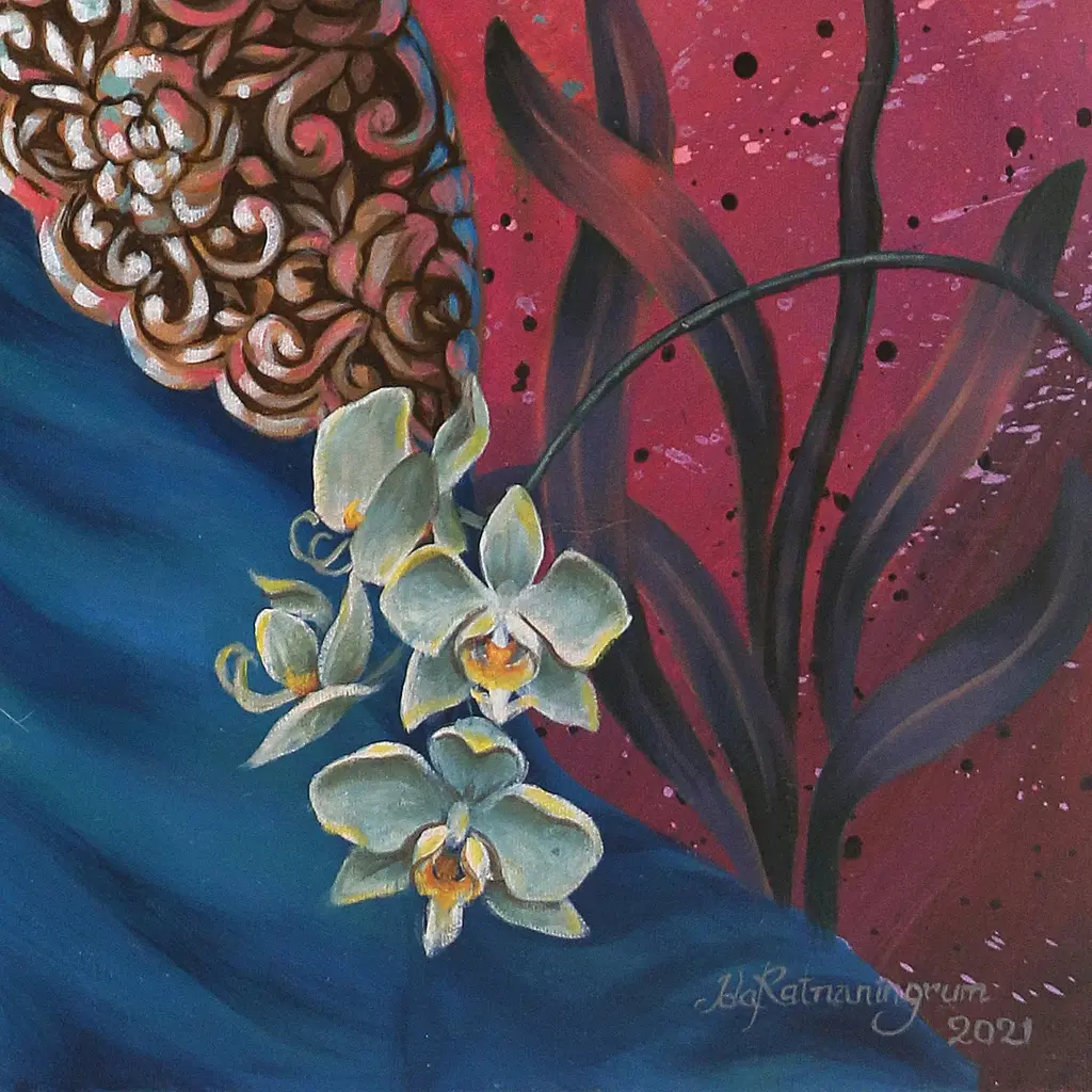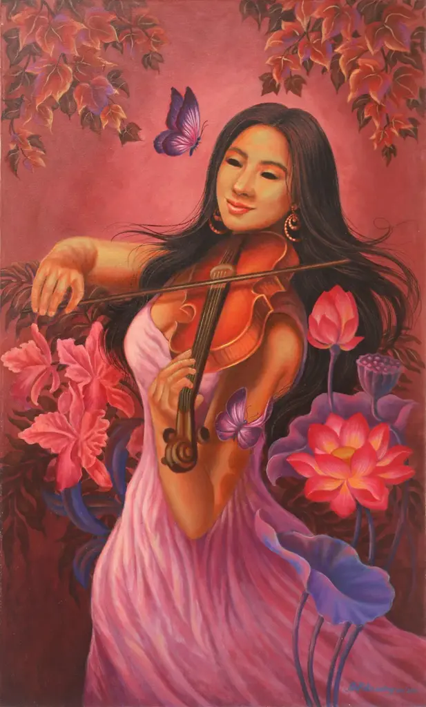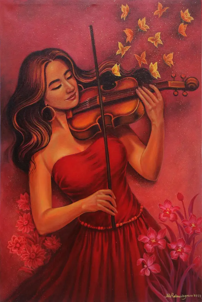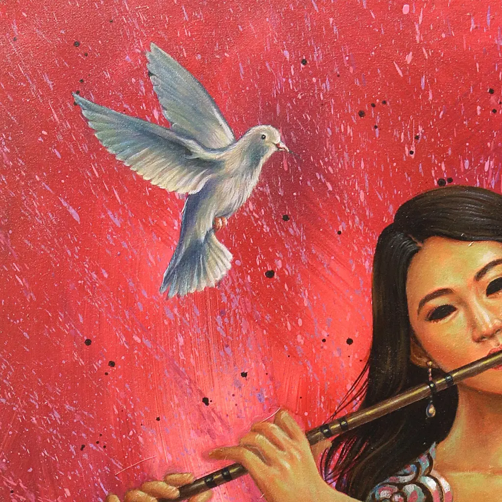 "An uncertain life requires entertainment so that the soul remains free without pressure," says Javanese artist Ida Ratna Ningrum, who creates this painting to celebrate the healing power of music. The scene depicts a young woman passionately playing her flute in order to recover from a broken heart.