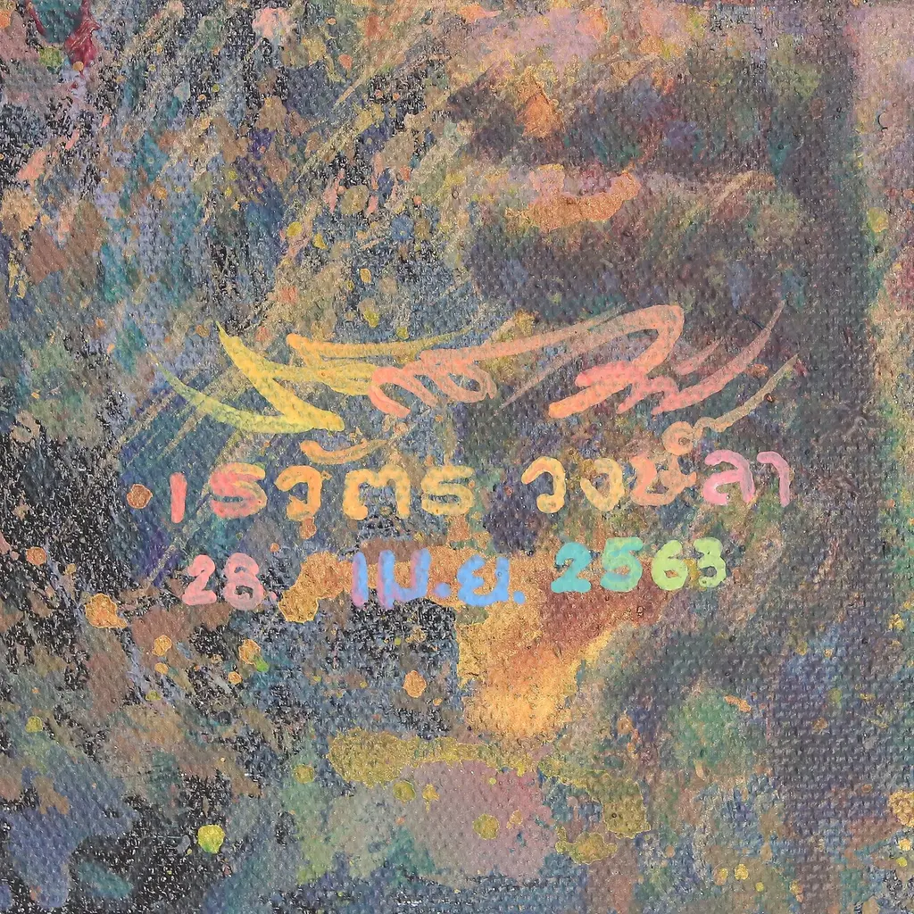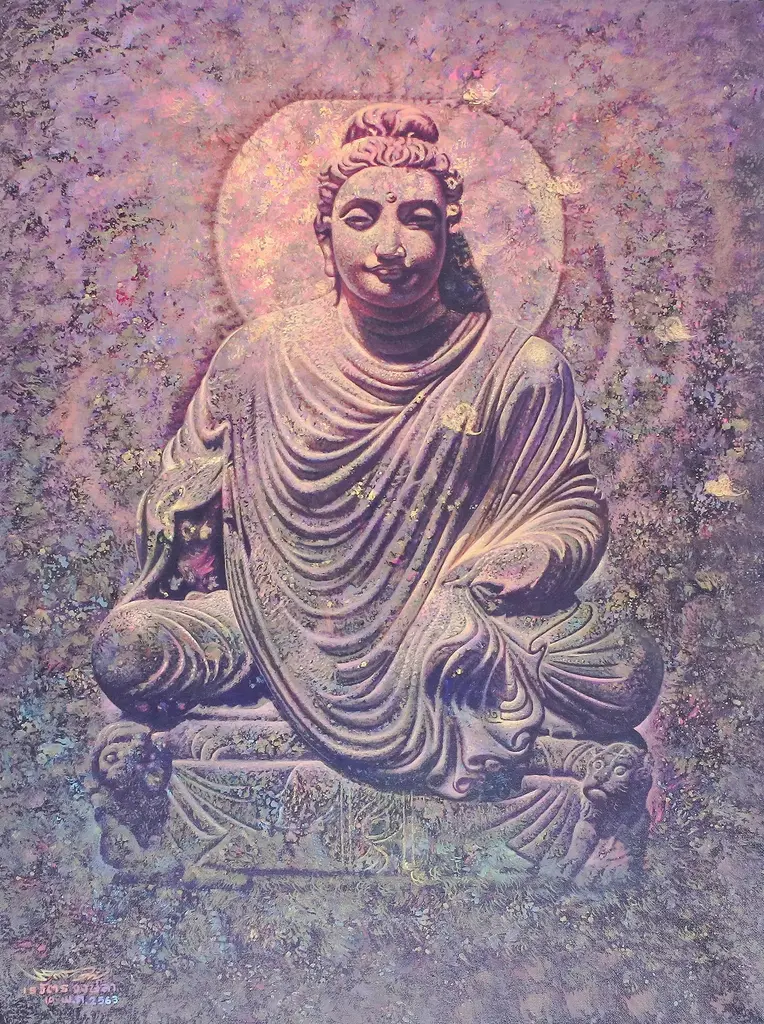 Hand raised in a blessing, a serene Buddha sits in the lotus position. Thai artist Rawat Vongla paints the original composition in acrylics on canvas with a muted palette of browns and pastel shades.