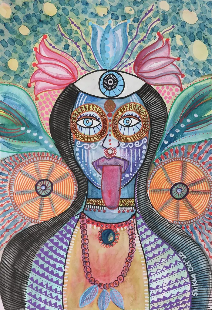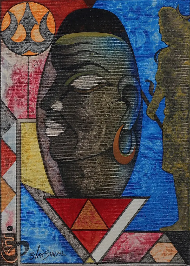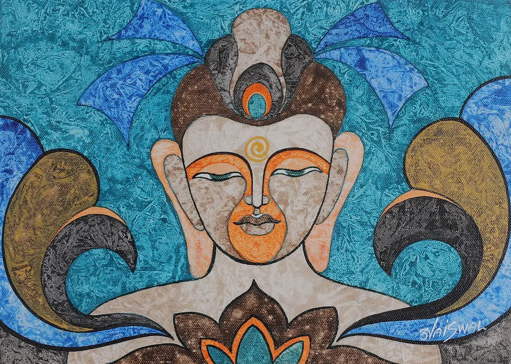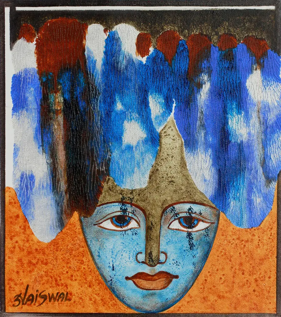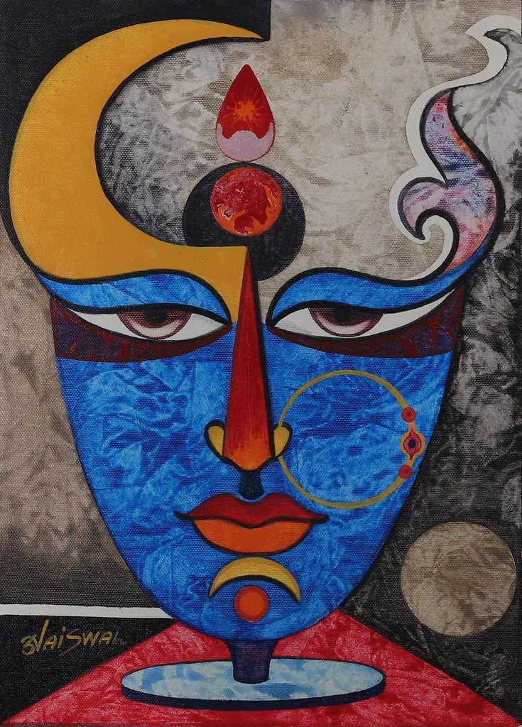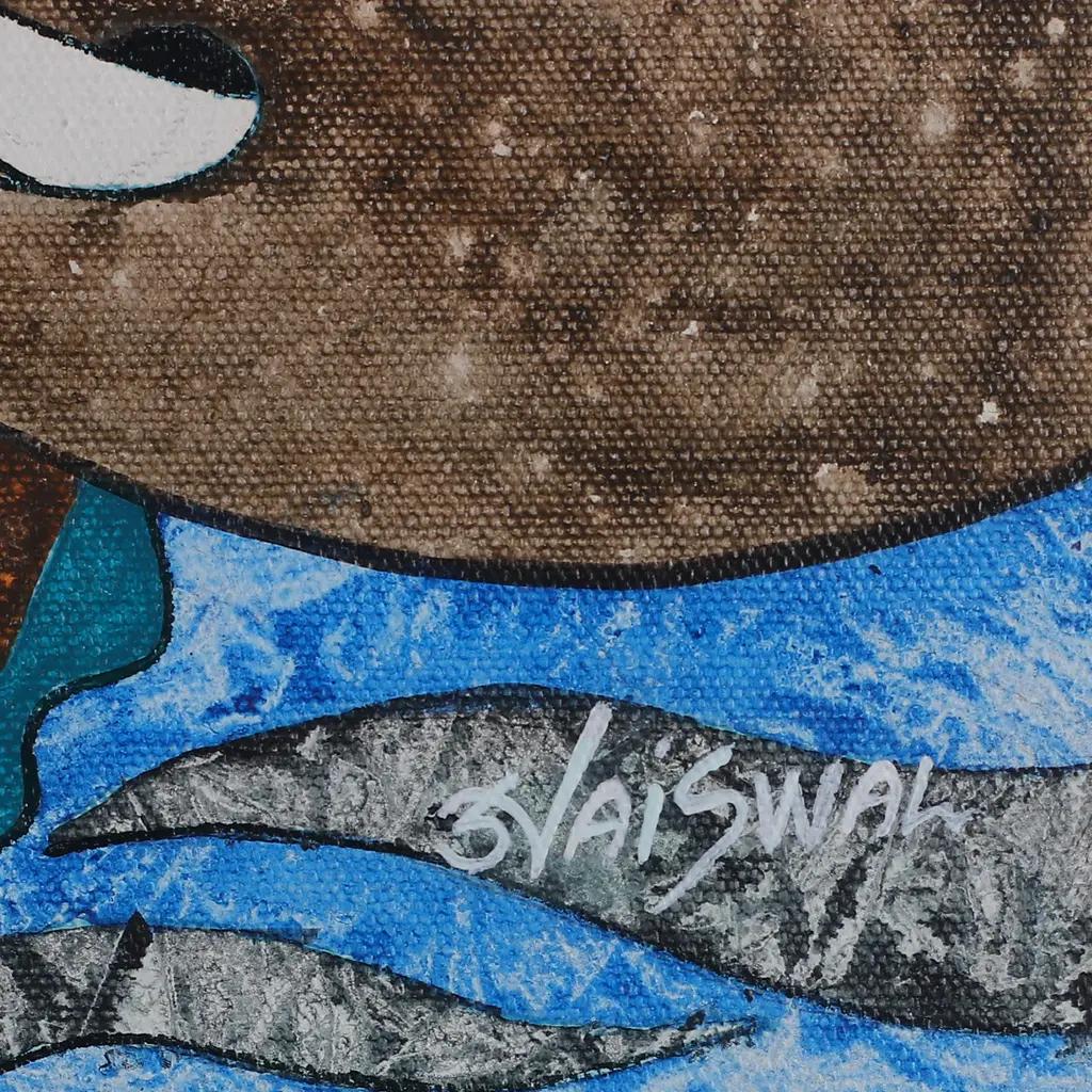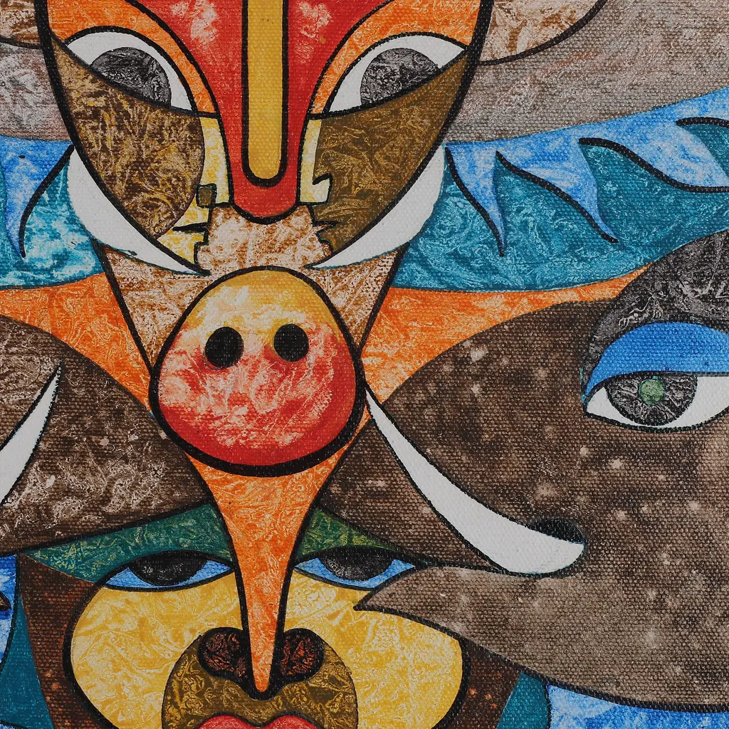 Humans and animals symbolize each a virtue in this expressionist painting by Sunil Jaiswal. Inspired by India's ancient philosophy, this acrylic compositing hides a meaning behind each element: at the top, a bull symbolizes magnificence; on the sides, elephants symbolize resilience; at the bottom, a human face represents harmony; and finally, at the center, a red circle embodies divinity.The painting arrives signed and unstretched.