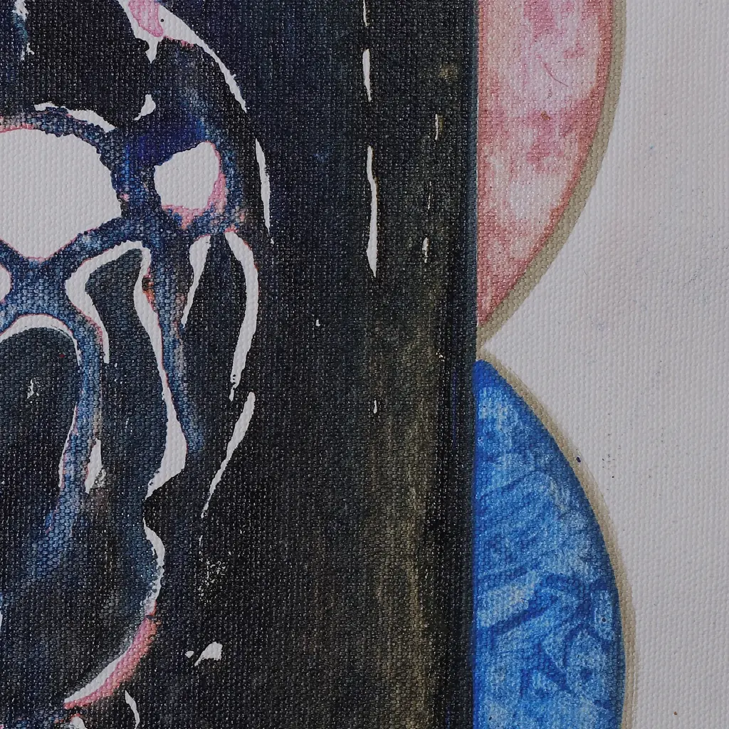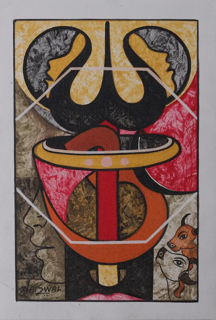 Designed to express deep contemplation and reflective thought, Sunil Jaiswal's acrylic painting is flooded with enigmatic dark and blue hues. The Indian artisan uses acrylic on canvas to create this sublime painting, portraying a planet and two faces at the bottom as a symbol of duality.The painting arrives signed and unstretched.