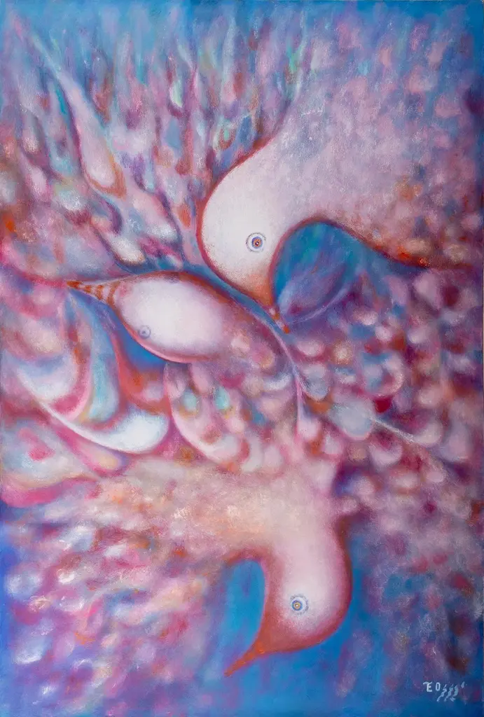 Signed Expressionist Painting Of Pigeons And Blue Sea- Explorers Of The Ocean