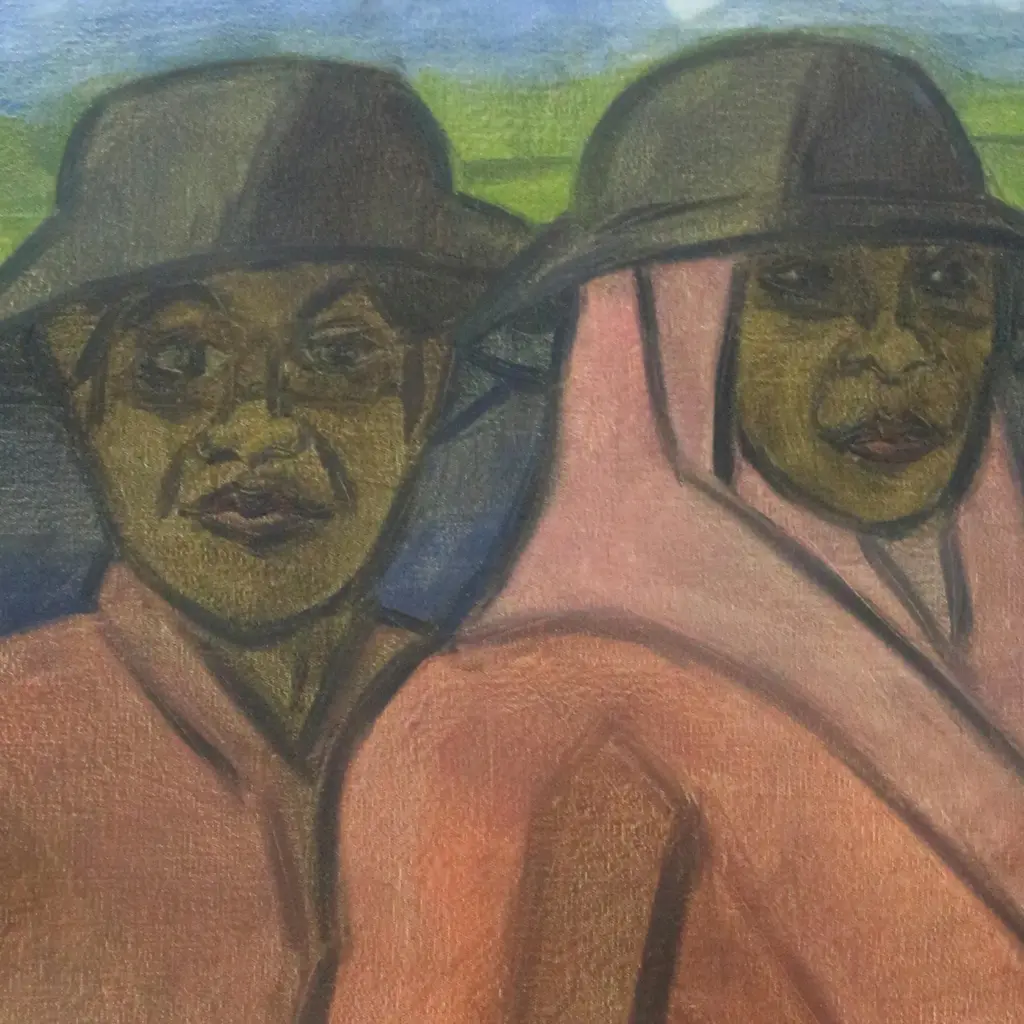 Gazing back at the viewer, two farmers are depicted in this painting by Balinese artist Purwadi. Known as dua petani in the Bahasa language, the two women pose against a green field in the background. Purwadi paints this scene in an expressionist style. Says the artist, "These two farmers took a picture during working in a rice field, in the middle of harvest time."