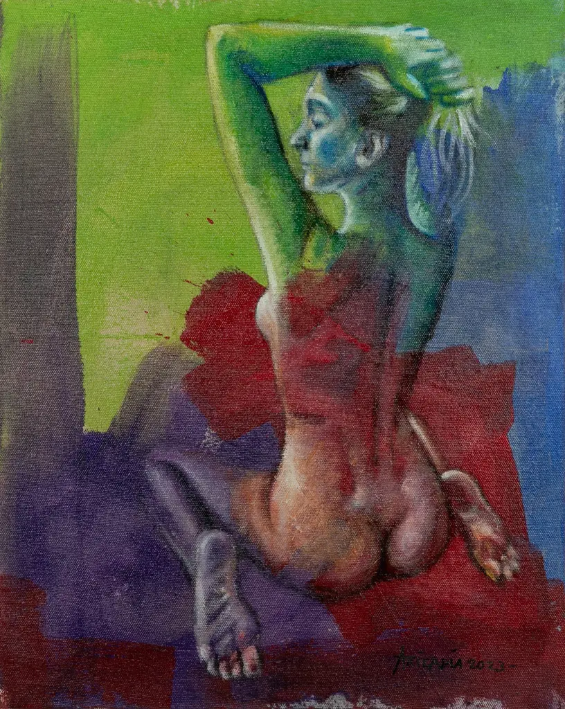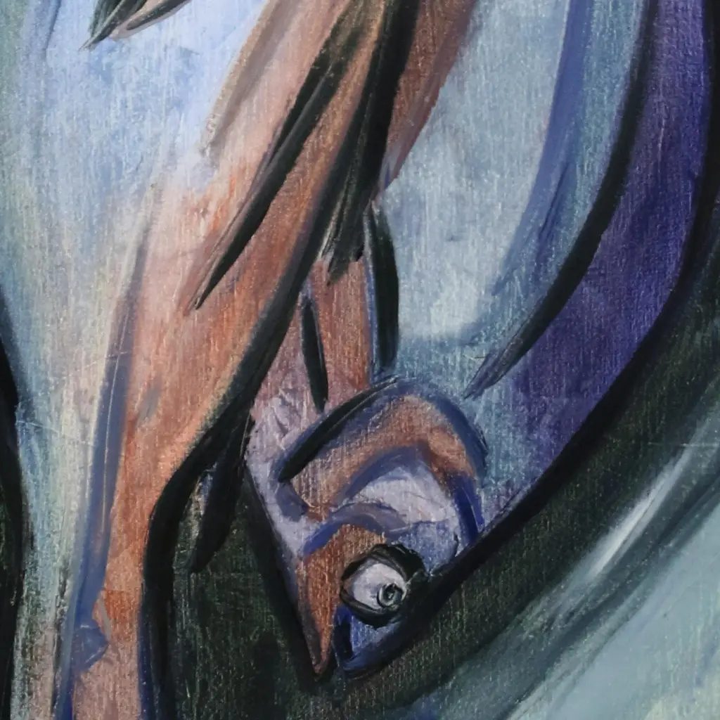 In tones of blue, brown, and beige, two fish touch their bellies in this painting by Balinese artist Purwadi. He paints this scene in a moody, expressionist style, depicting the fish duo against a background of blue, black, and pale blue. This composition will make an excellent addition to your home or beach cottage.