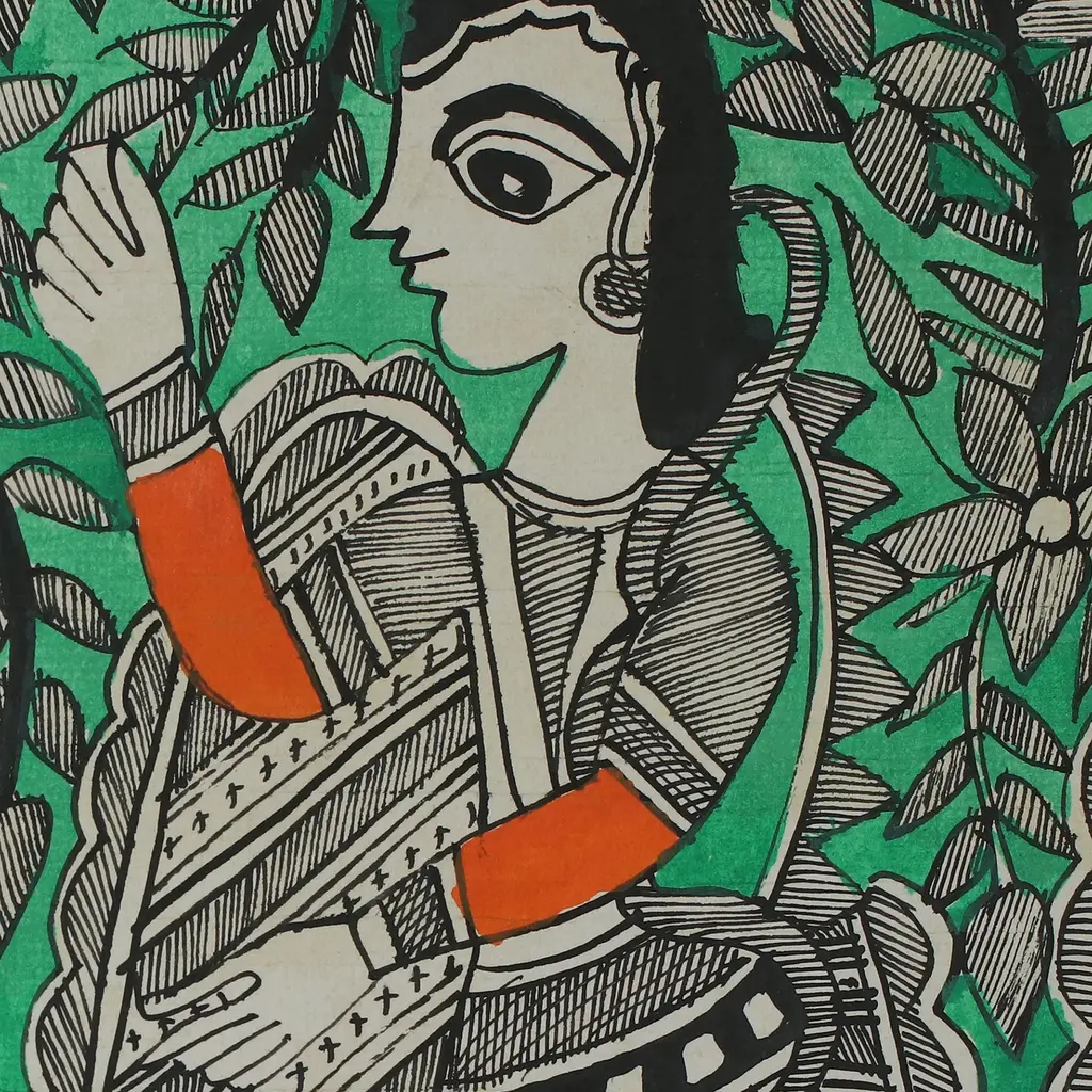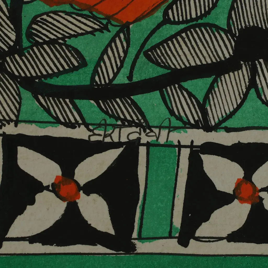 Protagonists of the Ramayana, a beloved Hindu epic, Rama and Sita are joined in marriage. Sita holds the floral garden exchanged as part of the ceremony and Rama holds a bow while her father and his younger brother accompany the happy couple. Devendra Kumar Jha works with natural dyes on handmade paper to create a beautiful Madhubani painting. Originating in northern Bihar, Madhubani painting was once used to decorate the floors and walls of homes. Life in harmony with nature is a popular theme for this art style. As each painting is an individual creation, each is unique. Colors and motifs may vary slightly from that pictured.