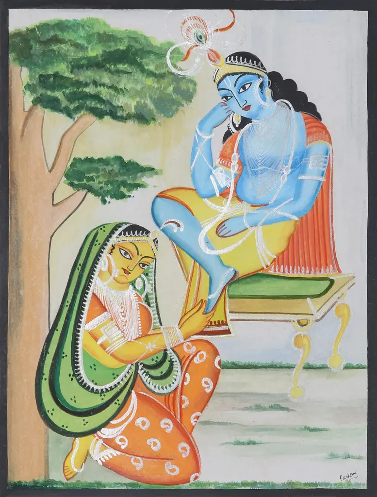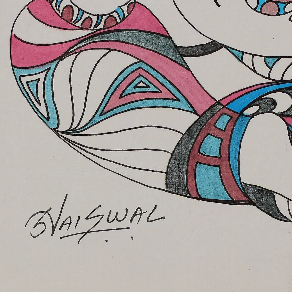 The spirits of Ganesha and Hanuman—both vessels of Vishnu—merge into one divine entity, portrayed by India's Sunil Jaiswal. The artist uses watercolor on paper to make a refined depiction of the gods, combining their prosperous and fearless spirits in a palette of intense hues that captivate with magical charm.The piece arrives signed and stretched.