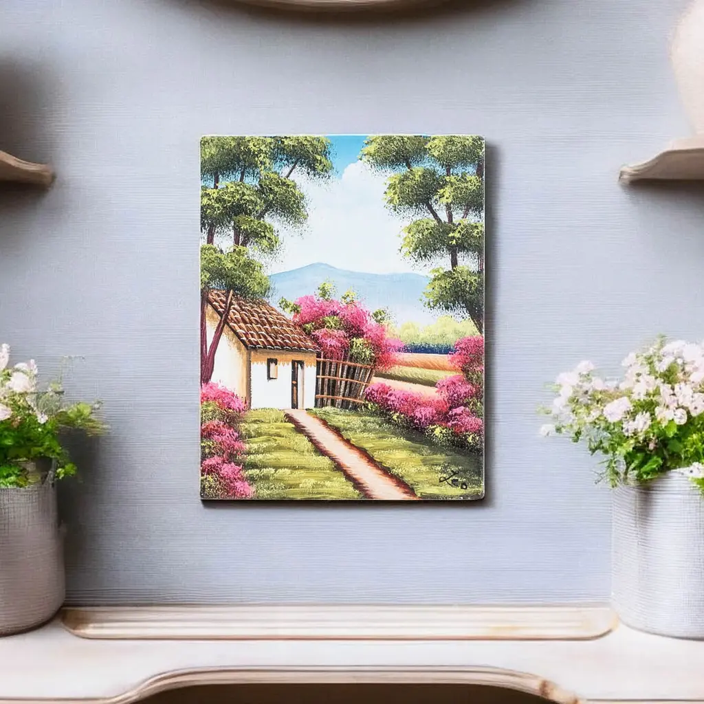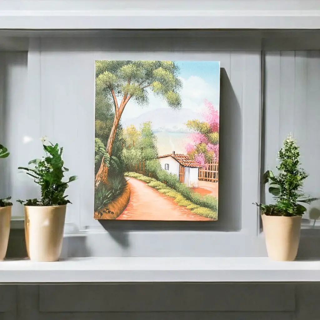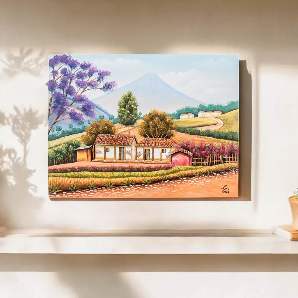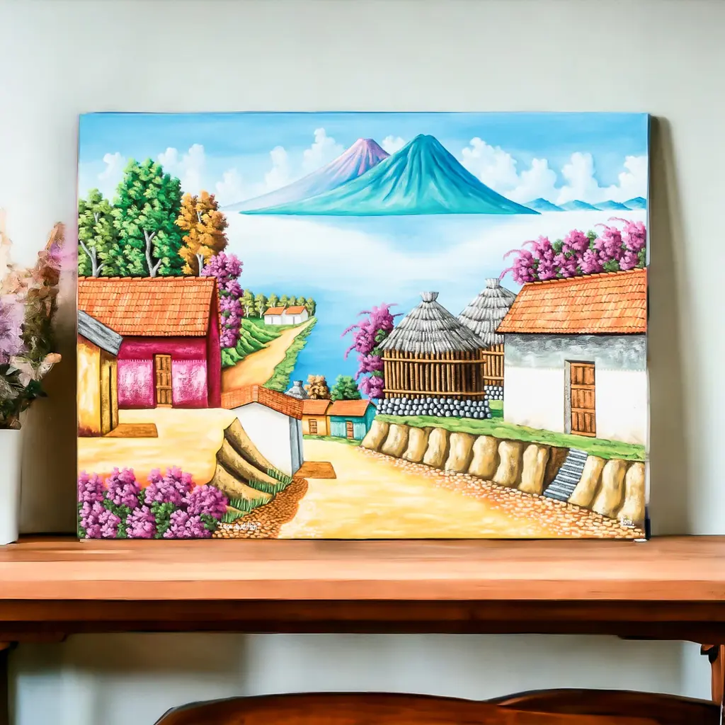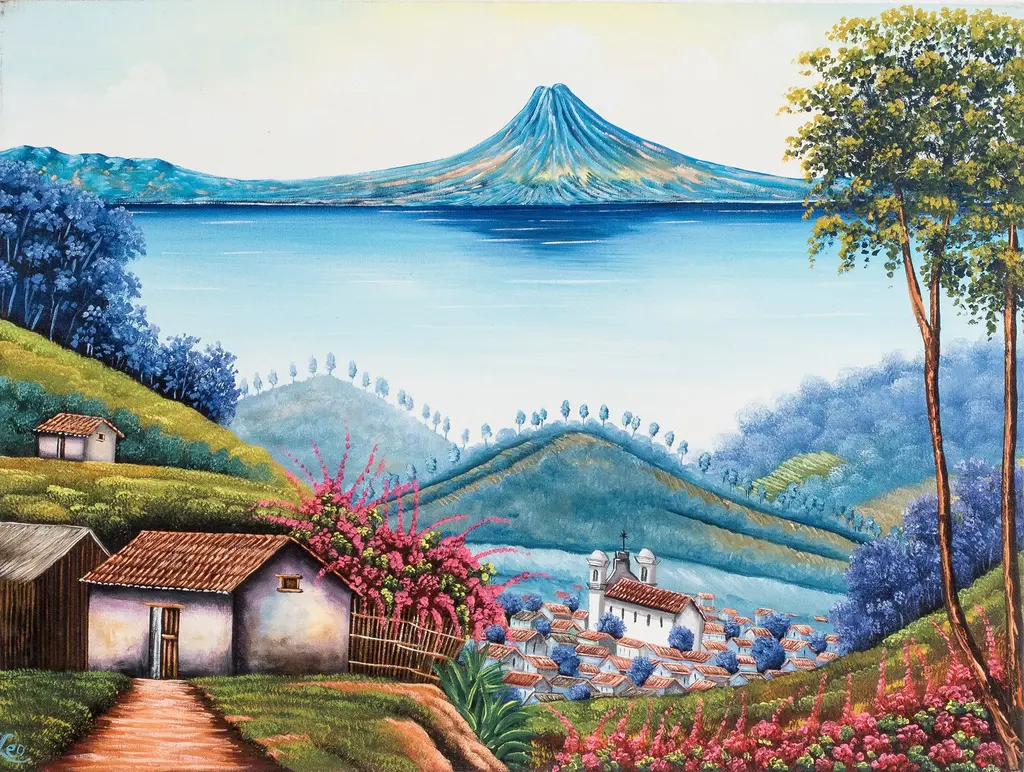 The serene blue sky and magnificent mountains surrounding this enchanted place are reflected on San Pedro La Laguna town's lake, inviting many to connect with Mother Nature. Artist Hugo Pichiya works with oil on canvas to create this stunning impressionist composition that captures the beauty of Guatemala's natural views. Made with a palette of serene hues, the painting depicts a traditional town blessed by a peaceful lake.The painting, titled Vista Al Lago in Spanish, arrives signed and stretched.